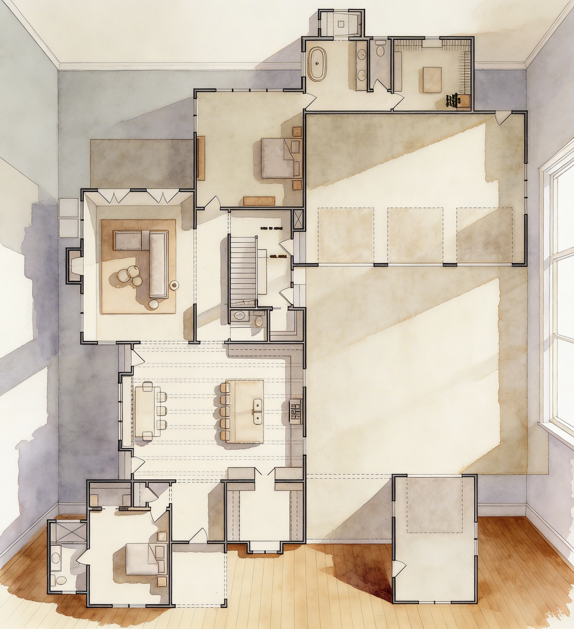 photorealistic render of a custom kitchen interior maintain original design and colors exactly do not alter color palette perimeter cabinetry is dark stained wood almost black with visible natural wood grain trough the dark color and a soft satin finish not painted not flat cabinet hardware is brushed brass handles and knobs kitchen island is a warm medium caramel stained wood with visible grain and a satin finish island and perimeter countertops match exactly in material and color range hood is brushed antique copper that almost looks used with a soft aged patina not polished not shiny wall sconces on either side of the hood are brass with a warm brushed finish lighting is warm 2700k 3000k a continuous wood soffit architectural band runs along the top of the cabinetry in an antique wood tone with subtle aging the faucet is matte black in the island make it so we can see all perimeter cabinets doorways are pocket doors with trim that matches the surrounding wood tones through the doors are just a white rooms use realistic natural lighting soft shadows and accurate material reflections emphasize wood grain texture and depth and subtle metal reflectivity avoid overexposure avoid high gloss finishes and do not change or reinterpret any colors there are no seams in the island and the doors are pocket doors remove the handles on the pockets doors