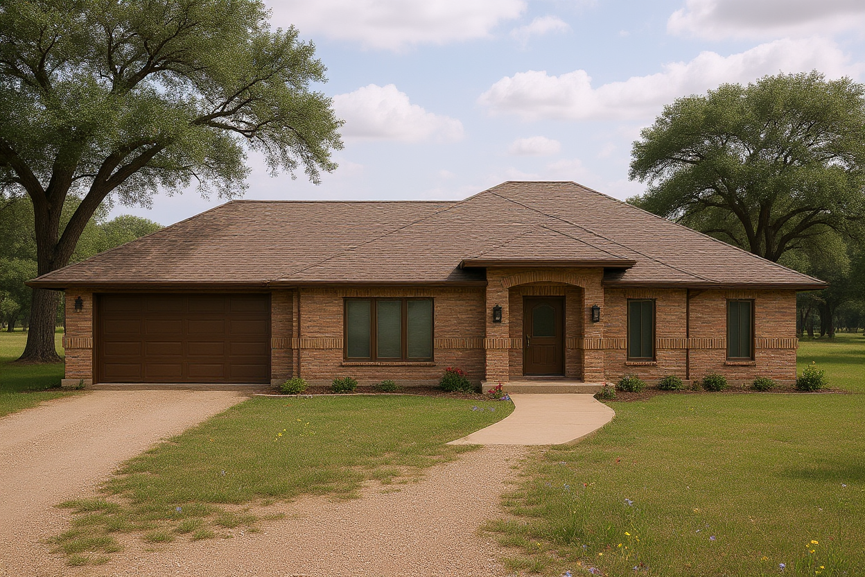 prairie style texas ranch land setting with foundation planting and wildflowers mottled brown roman brick bronze paint on doors windows fascia texas live cream colored window frames oak trees in yard taper walk up to front porch gravel drive to garage door infill yard with texas bluebonnets indian paint brushes and native wild flowers in yard ramp sidewalk up to front porch ledge at base of house is concrete add wall light to right of garage door
