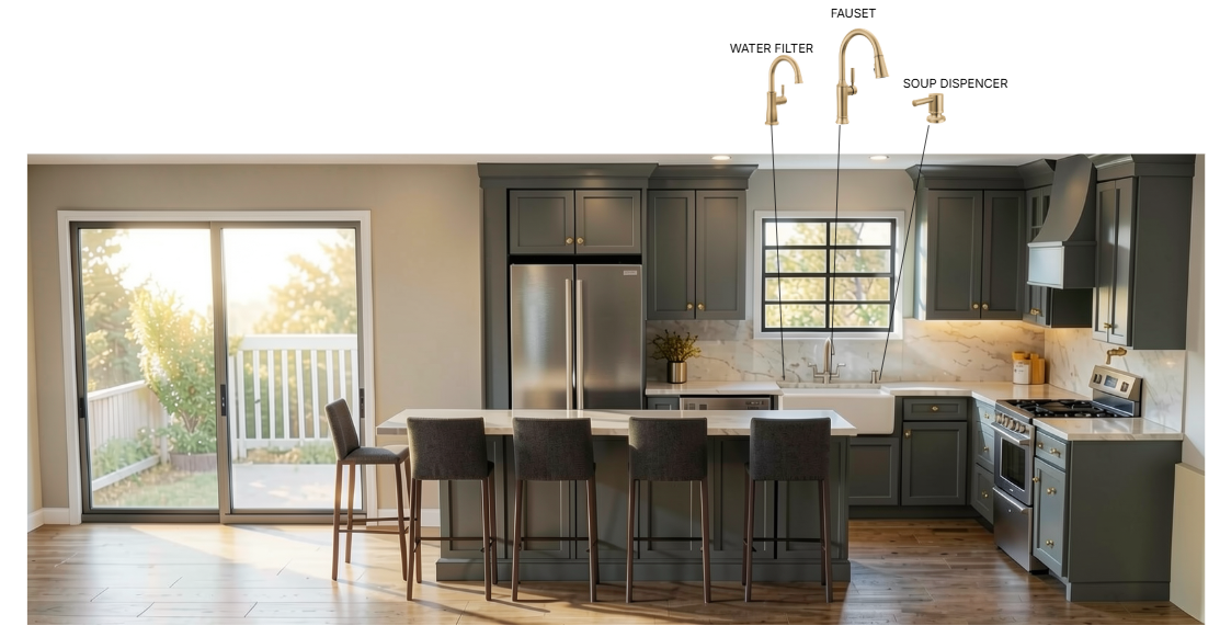 keep everything the same do not change color or materials only add the sink faucet soup dispenser on the right and water filter on the left use the exact ones that are in the picture on the sink do not change anything else or add anything except the faucet water filter and soup dispenser