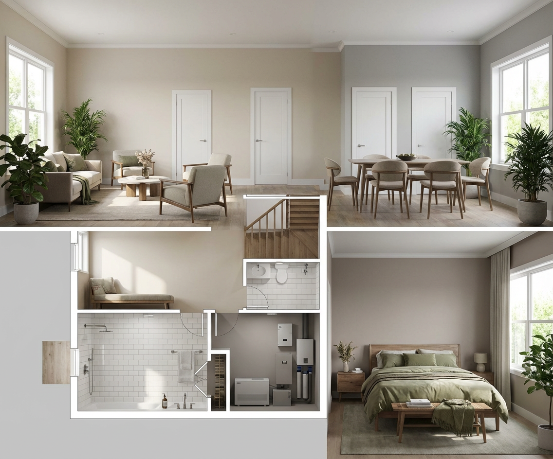 render photo realistic european style black windows black slate roof off white stucco concrete gray cast stone blocks lush landscaping circle drive with fountain vibrant blue sky