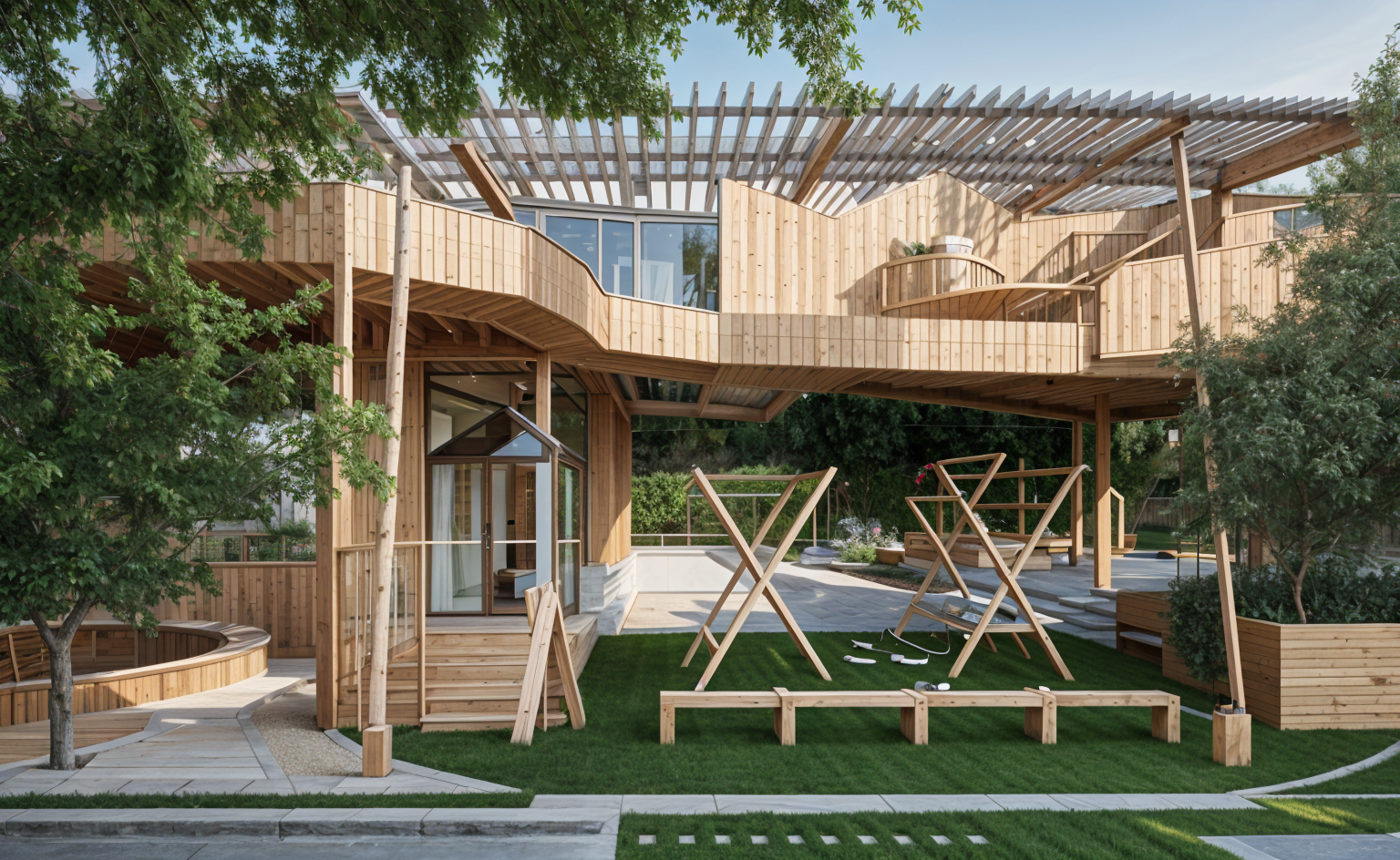 functionalism wide angle shot community center day time natural material a lot of full grass open area and sitting area flowy pathway wood material architecture