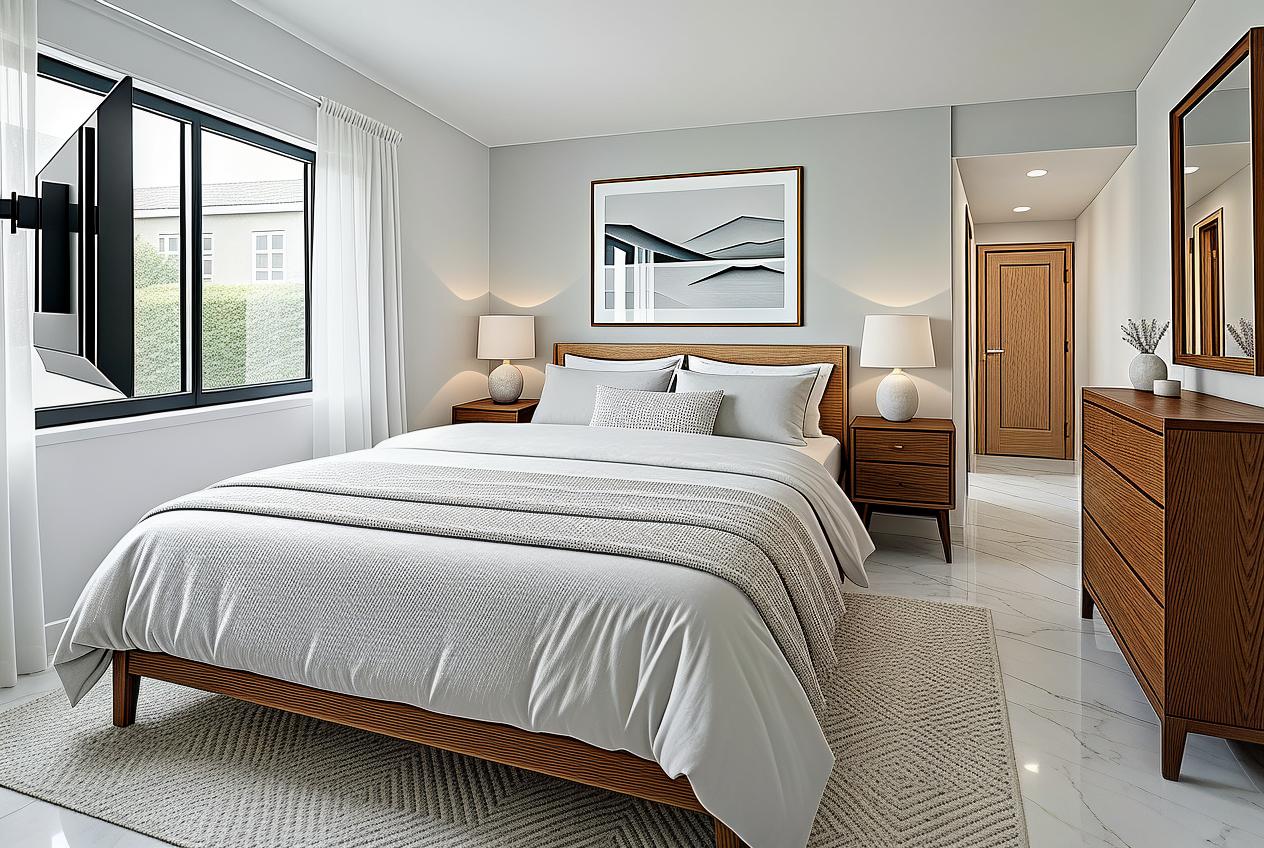 voglio che me la generi in uno stile moderno e raffinato con dettagli eleganti la stanza deve avere colori caldi sabbia oro bianco luci soffuse e arredi di pregio inserisci materiali come marmo legno scuro magari in una parete decorativa dietro la testiera del letto e tessuti di qualit deve rimanere la tv e la stessa vista fuori la finestra