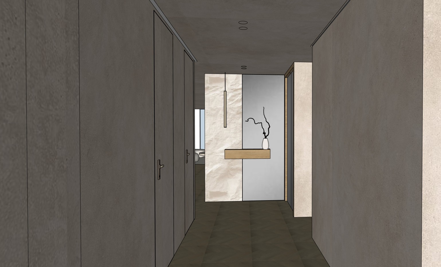 archsynth optimised prompt photorealistic render of the uploaded sketchup model important keep exact geometry layout proportions and camera angle from the model image do not redesign move add or remove any elements only improve materials textures and lighting realism camera composition maintain the exact one point perspective from the entrance hallway looking toward the feature wall keep framing identical to the model feature wall main focus apply rock texture using image reference 1 texture must be fine lightly dense seamless not heavy or overly rough keep it refined and continuous no large gaps or chunky stones linear pendant already in model keep exact position and size lighting effect soft warm grazing light washing the wall highlighting texture depth match reference behaviour not brightness mirror use the mirror exactly as modeled slim black frame clean flush realistic reflection subtle not overly sharp right side lift lift doors brushed metal finish surround timber cladding matching the wood detail in the model same tone and grain left side opening show a minimal glimpse into dining living area keep it soft slightly out of focus not a focal point walls ceiling apply warm beige french wash finish matte soft tonal variation subtle texture not flat paint not glossy floor herringbone timber flooring winston hill oak tone natural grain calm colour matte finish no high gloss lighting very important use only lighting positions from the model do not add or move lights track light cutouts both sides of ceiling warm soft directional gentle wash along walls surface mounted downlights warm diffused no harsh hotspots overall lighting 2700k 3000k warm tone soft ambient high end residential mood balanced exposure no overexposure rendering quality strong global illumination soft shadows accurate light falloff realistic material response wood metal mirror textured wall no artificial shine or plastic look style minimal calm high end interior focus on materiality and lighting interaction not decoration