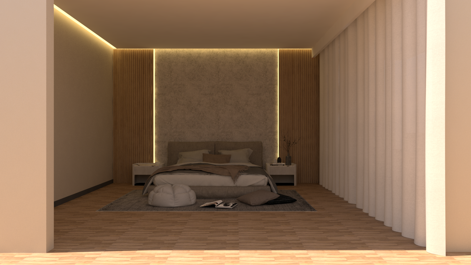 render a serene cozy bedroom with soft ambient lighting incorporate a neutral color palette with warm beige walls and subtle textured light gray for the headboard feature a modern bed with light gray linens and plush pillows in soft beige and brown use warm wood tones for the flooring and side panels complementing the minimalist bedside tables in white add a sophisticated gray rug beneath the bed and a sleek low pouf in light gray set a tranquil atmosphere with gentle glowing led strip lighting along the headboard enhancing the peaceful relaxing mood