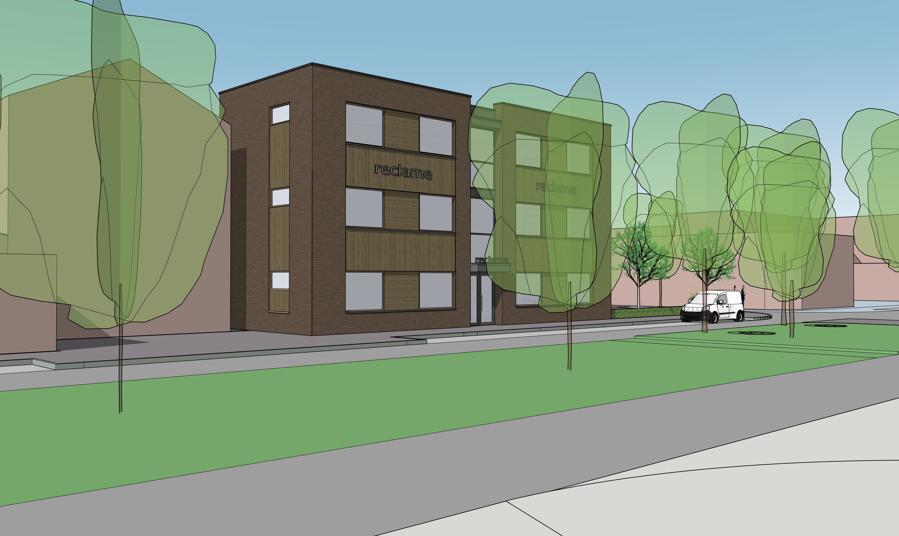 the weather is sunny with a few clouds in the sky add some people and cars arund the building behind the glass of the building there are some offices visible