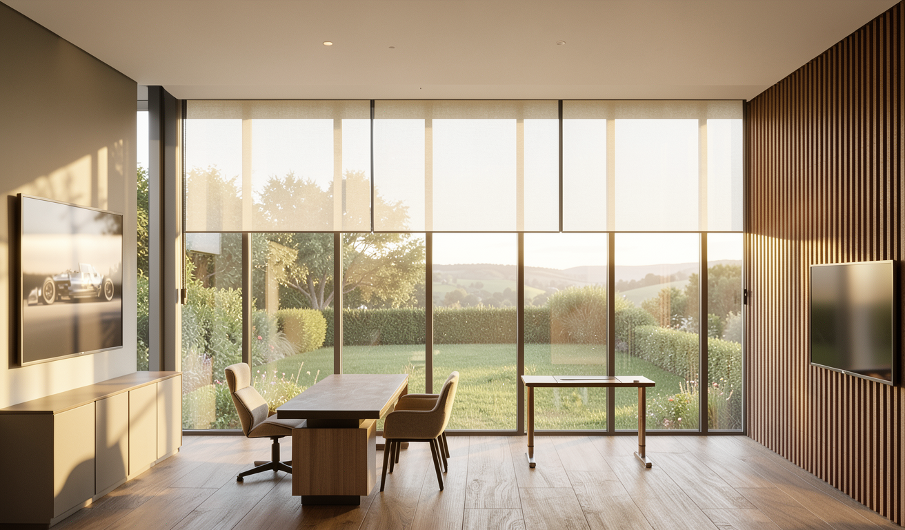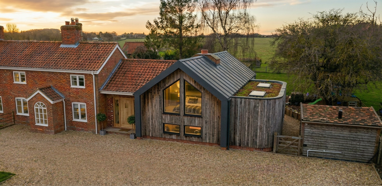 back view of a clean rustic barn home architectural exterior home rendered in cinematic golden hour lighting with bits of blue skies and sunlight coming through the clouds barn home in a lush beautiful montana countryside with green and yellow rolling hills and a faint hint of a mountain range in the far distance in the background warm glow and reflections off of the windows select grade vertical wood siding green manicured landscape around structure with gardens and patches of grass black standing seam metal roof high fidelity photorealistic visualization crisp shadow falloff refined facade geometry soft atmospheric depth premium architectural photography mood ultra clean composition and materials flat roof photorealistic render small concrete path around the exterior of the cabin add black trim around the windows and doors