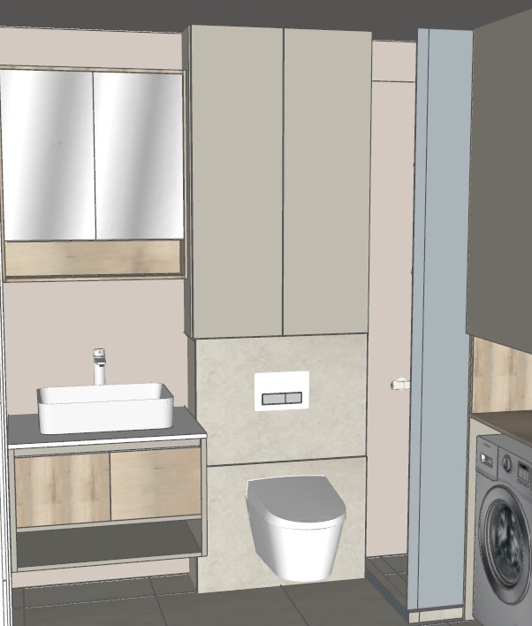 everything is like on the sketch the colors are same like in the sketch cashmere egger and oak egger top of the vanity cabinet is white compact tiles are matt beige shower glass is transparent and placed on side of the washing maschine add some accessories