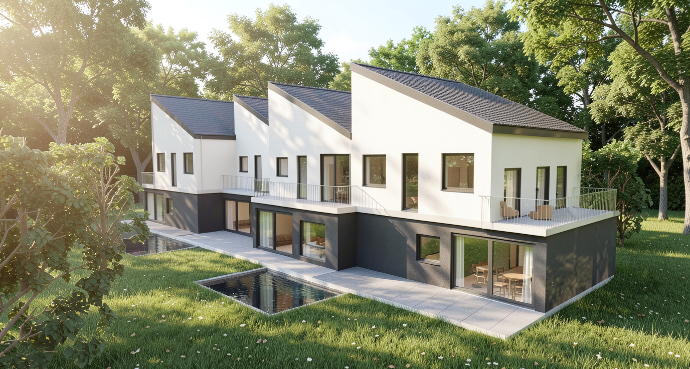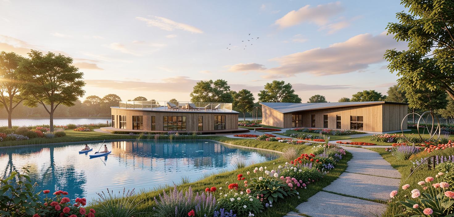 generate a serene architectural render featuring two curved buildings with timber cladding and large glass windows surround them moved lawn and strategically placed clusters of trees incorporate a tranquil pond in the foreground to the left of the image with its blue water reflecting the sky and paddleboarders on the pond add pathways with vibrant flowerbeds create a warm golden sunset glow to enhance the peaceful atmosphere casting soft shadows across the scene