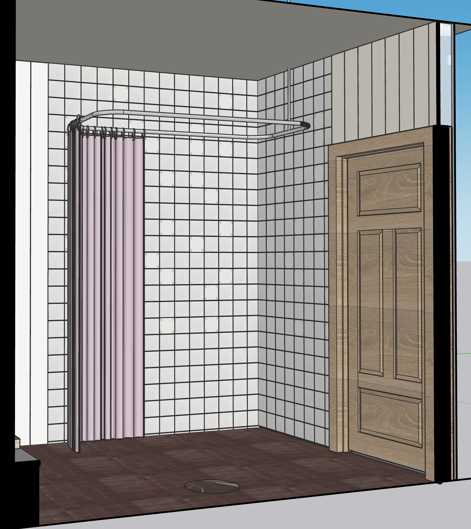 render this photorealistic lots of atmosphere look like it was taken on an slr camera satin paint texture on panelling sheen on tile rich gloss on tiles chrome on shower curtain rail