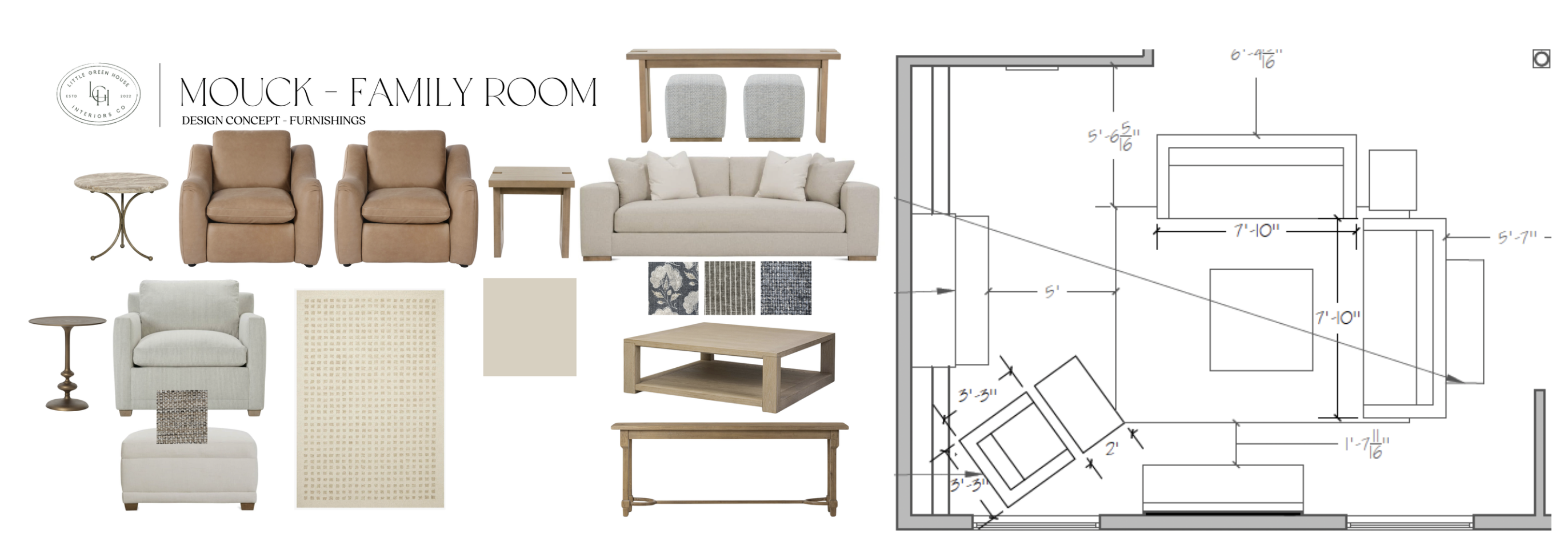render the furnishings from the design board on the left into the floor plan while making the walls sherwin williams dumpling and the drapes on the window a brown linen make this look like a photorealistic floor plan