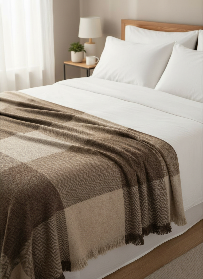 show bed from front so tartan throw is fully visible
