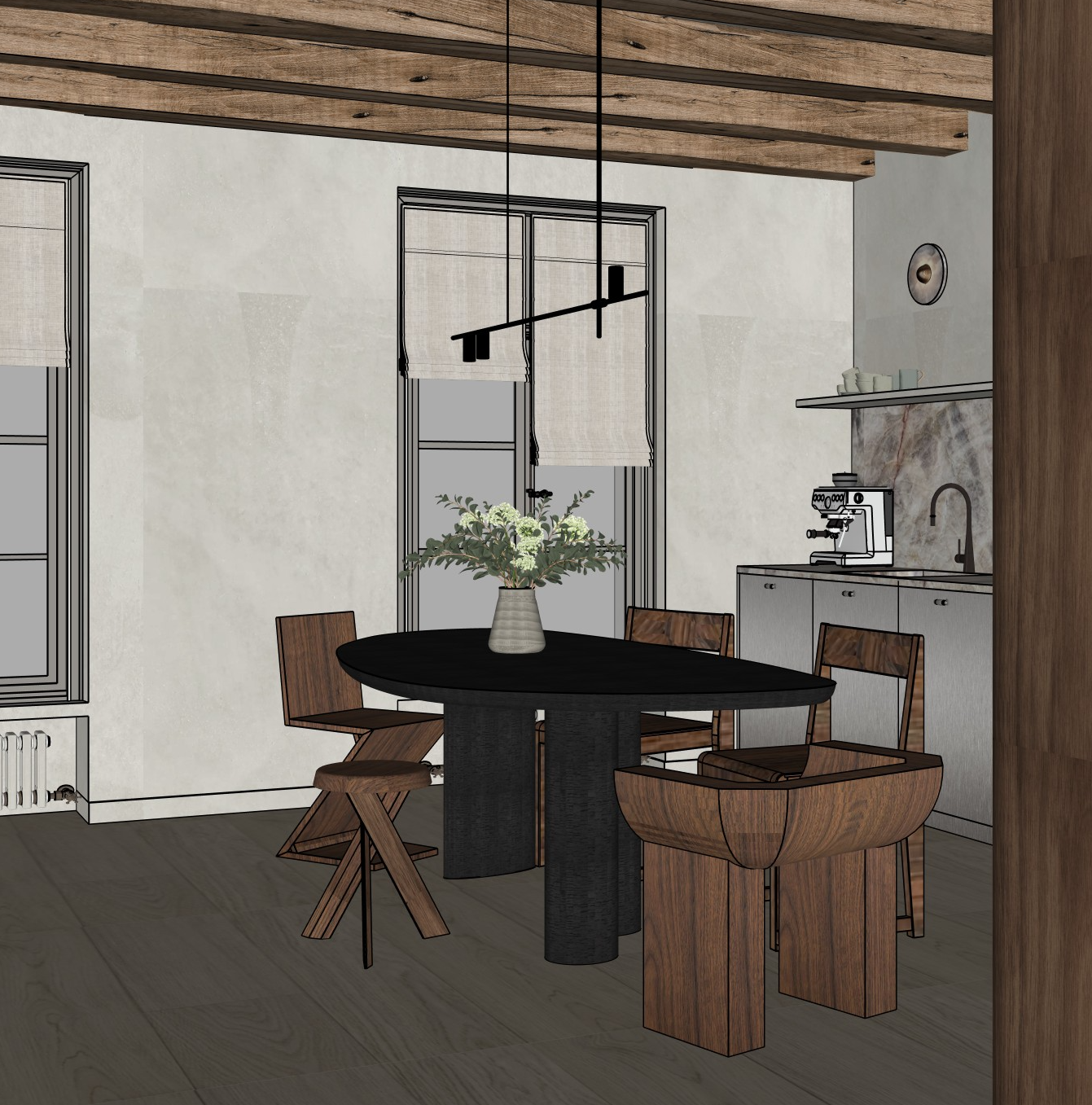 the walls are lightly plastered the lower cabinets are in stainless steel the floors are in ancient wood the wall lights are the median model from apparatus studio in alabaster the appartment is on the fourth floor of a parisian building the wooden beams are in light greige but more greyish elm and more irregular there are linen roman blinds on the windows the ceiling is in the same color as the walls the stone is taj mahal quartzite outside the window should be visible a parisian building window guard the dining table is in black oak the floorboards should be less large no lightbulbs should be seen on the pendant light there is a thin baseboard on the bottom of the walls the flowers are in different shades of green the vase is in taupe style like athena calderone