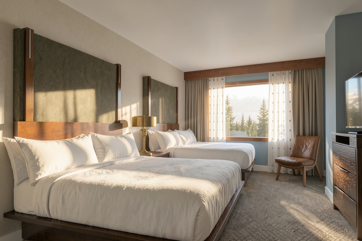 evening low mountains pine trees campground driveway to trailer campfire