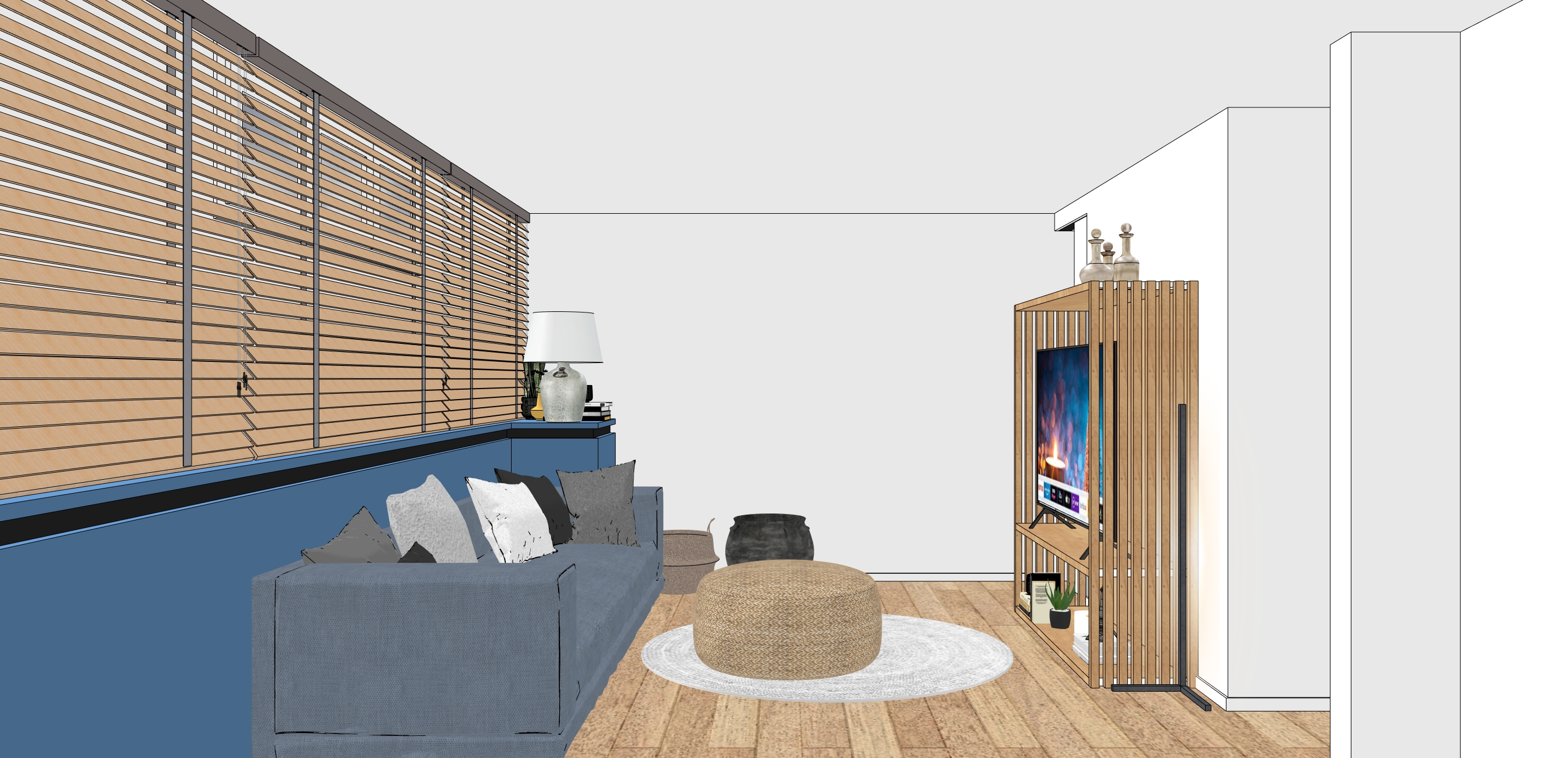 high end architectural render of a minimalist basement interior warm and cozy atmosphere on the left wall closed faux blinds with no natural light passing through primary illumination comes from a subtle integrated led strip placed behind the blinds creating a soft warm glow there s no strip led on ceiling primary illumination comes from an abat jour and a floor lamp mood intimate moody clean lines soft shadows photorealistic 8k resolution