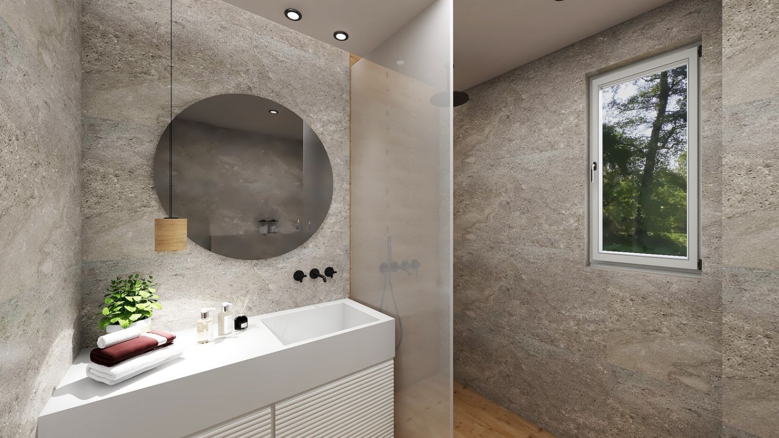 modern minimalist bathroom with a serene atmosphere featuring warm beige stone walls and a smooth wooden floor include a round mirror with a reflective surface the vanity is sleek and white with neatly arranged white and burgundy towels add a touch of greenery with a small vibrant plant incorporate soft ambient lighting with a small beige pendant light a large window showcasing a peaceful view of lush green trees and a clear blue sky