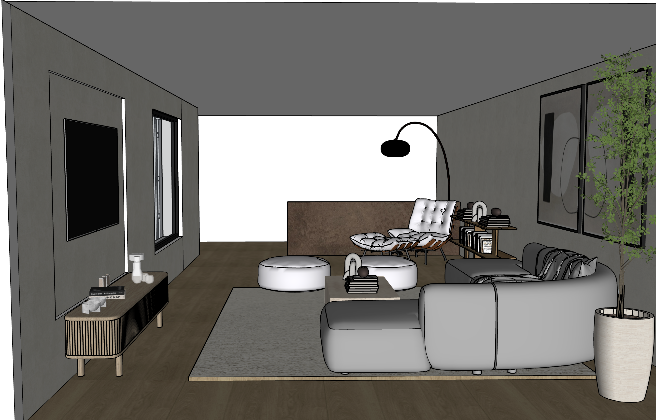 mejorar iluminaci n con sombras naturales pared de atr s en limewash como la derecha techo blanco sillon de la derecha en borreguito blanco armchair final en color beige de lino los puff en lino blanco la mesa rectangular en travertino y la barandilla de pared de al lado del armchair en acero corten