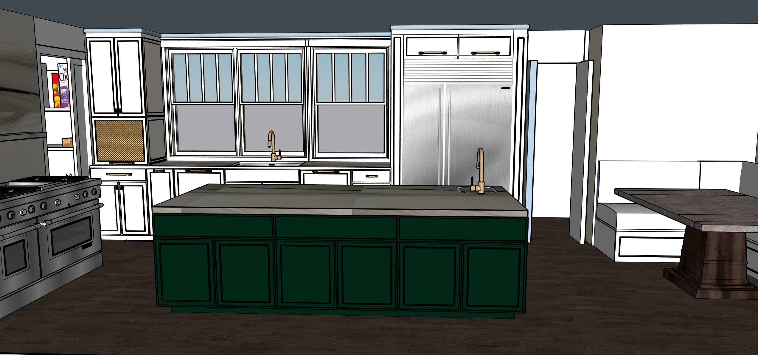 the cabinets on the perimeter are a painted wood in a light tan color like benjamin moore baby fawn there is an appliance garage cabinet to the left of the windows when facing them that has a brass mesh insert