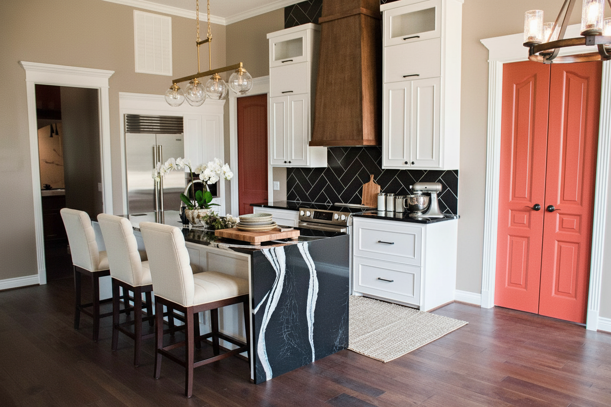 white stucco garage dark wood modern garage door white board and batten house green front lawn colorful sky