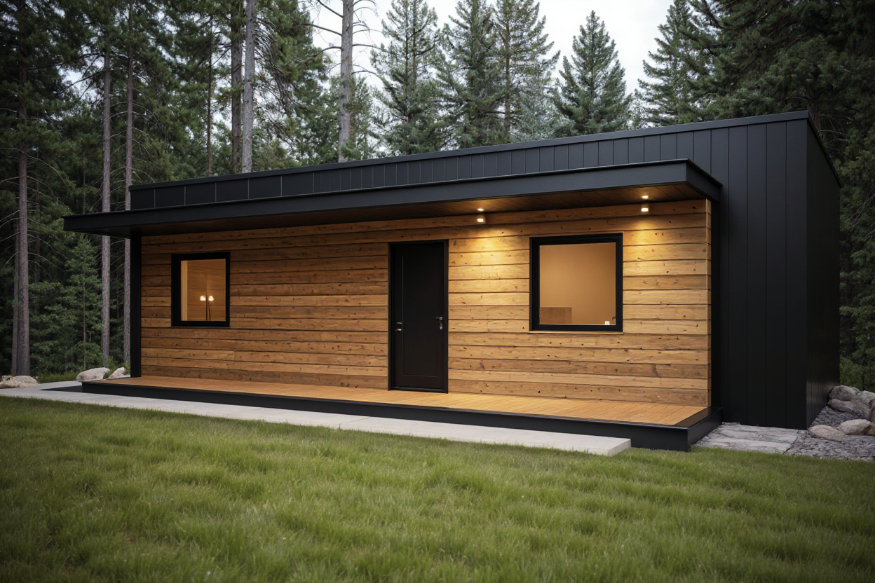 modernist exterior shot add a fire pit in the grass with two muskoka chairs around it architecture