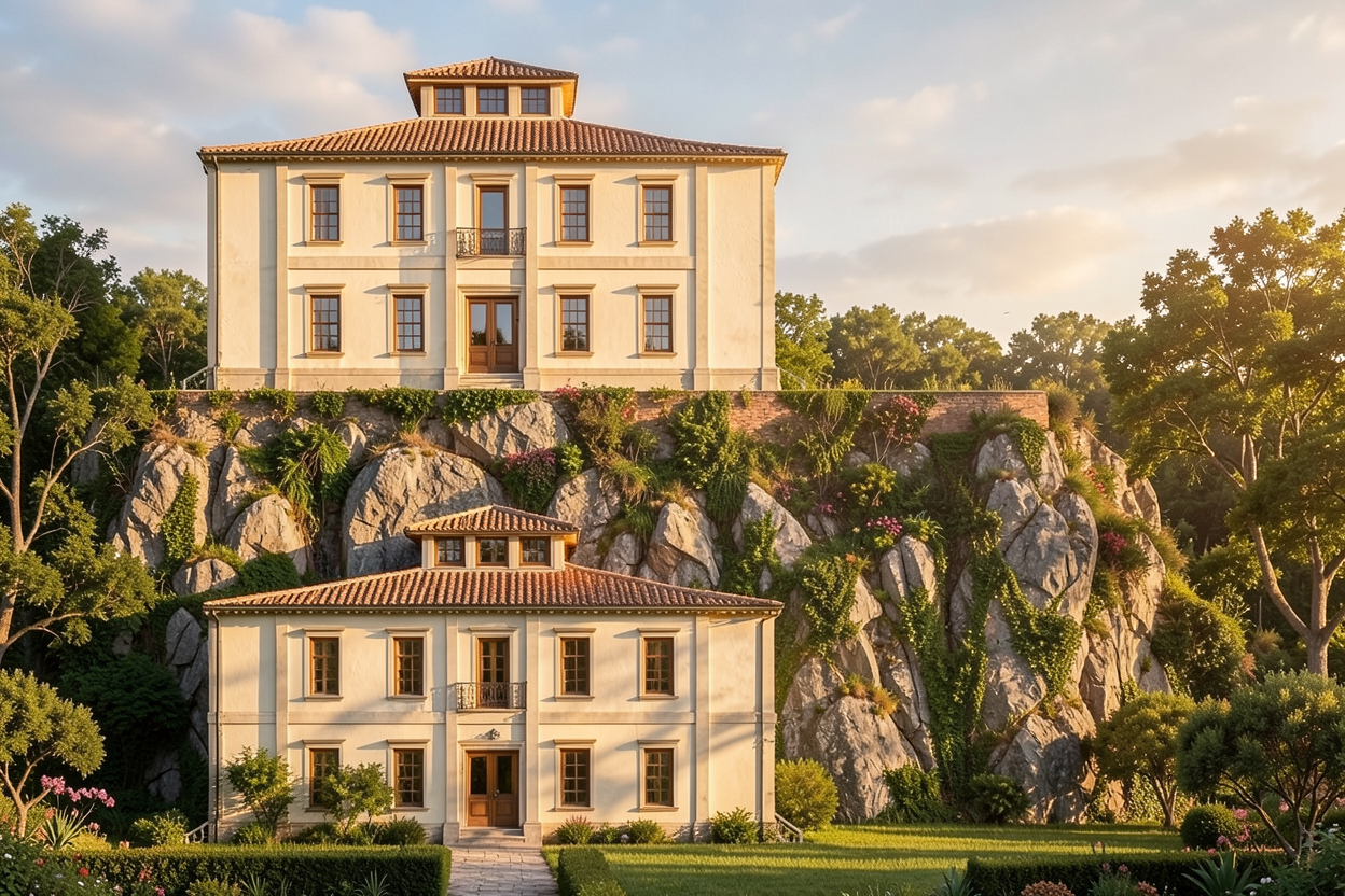 render this modern transitional luxury home change the exterior color of the vertical board and batten to a creamy white add light shrubs and flowers around the sides but not the driveway keep the windows and gutters and trim black change the front doors to be walnut color wood with half glass change the entry pillars to the same wood add a few trees to the lot behind the house add realism but no shadows on the house from trees