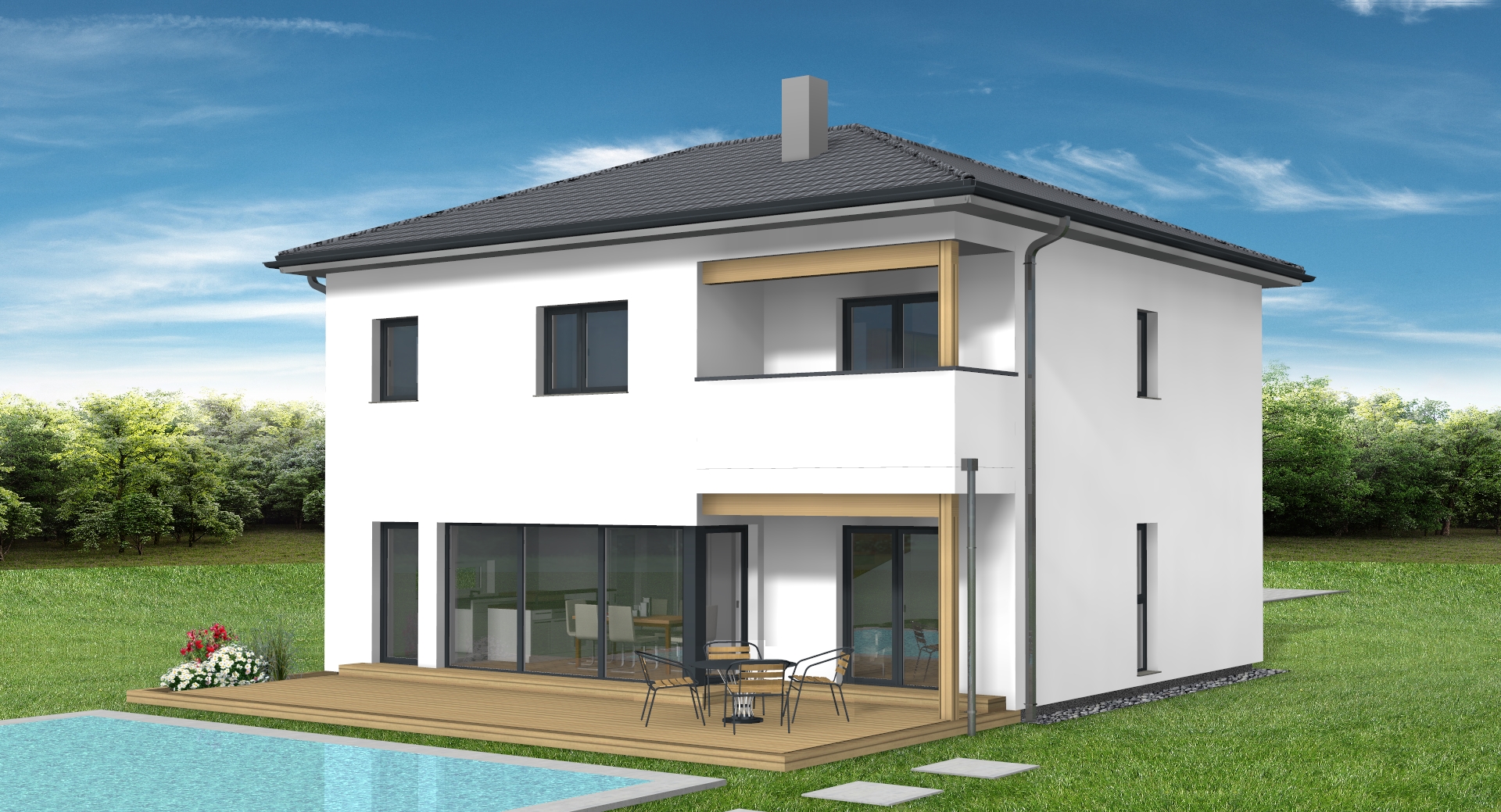 bitte erstelle f r exakt dieses haus eine realistische au enansicht s mtliche parameter und abmessungen des hauses bitte nicht ver ndern dachziegel anthrazit fenster und t ren anthrazit fassade wei das haus soll bitte in einem eleganten modernen aber dezent gestalteten garten samt pool vor der terrasse situiert sein