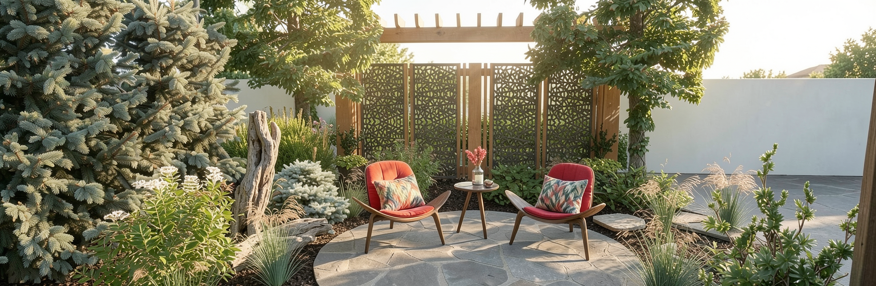add glassware on the shelves add beverages on the island add a six pack of beer on the counter under the shelves on the right add two wine bottles on the counter under the shelves on the left place a pergola over the kitchen place backyard scenery behind