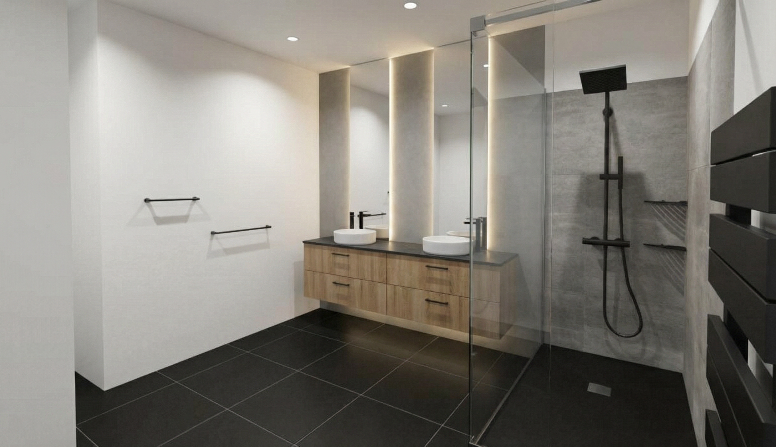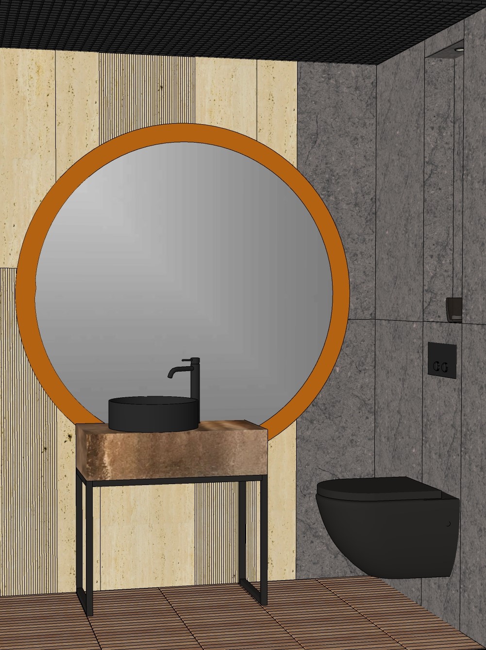 make a visualization based on the provided file the round mirror is smoked graphite with a copper circular frame the sink and faucet are glossy while the tiles are matte in the above the wc there is visible ceiling lighting turn the light on the ceiling is black with black spotlights