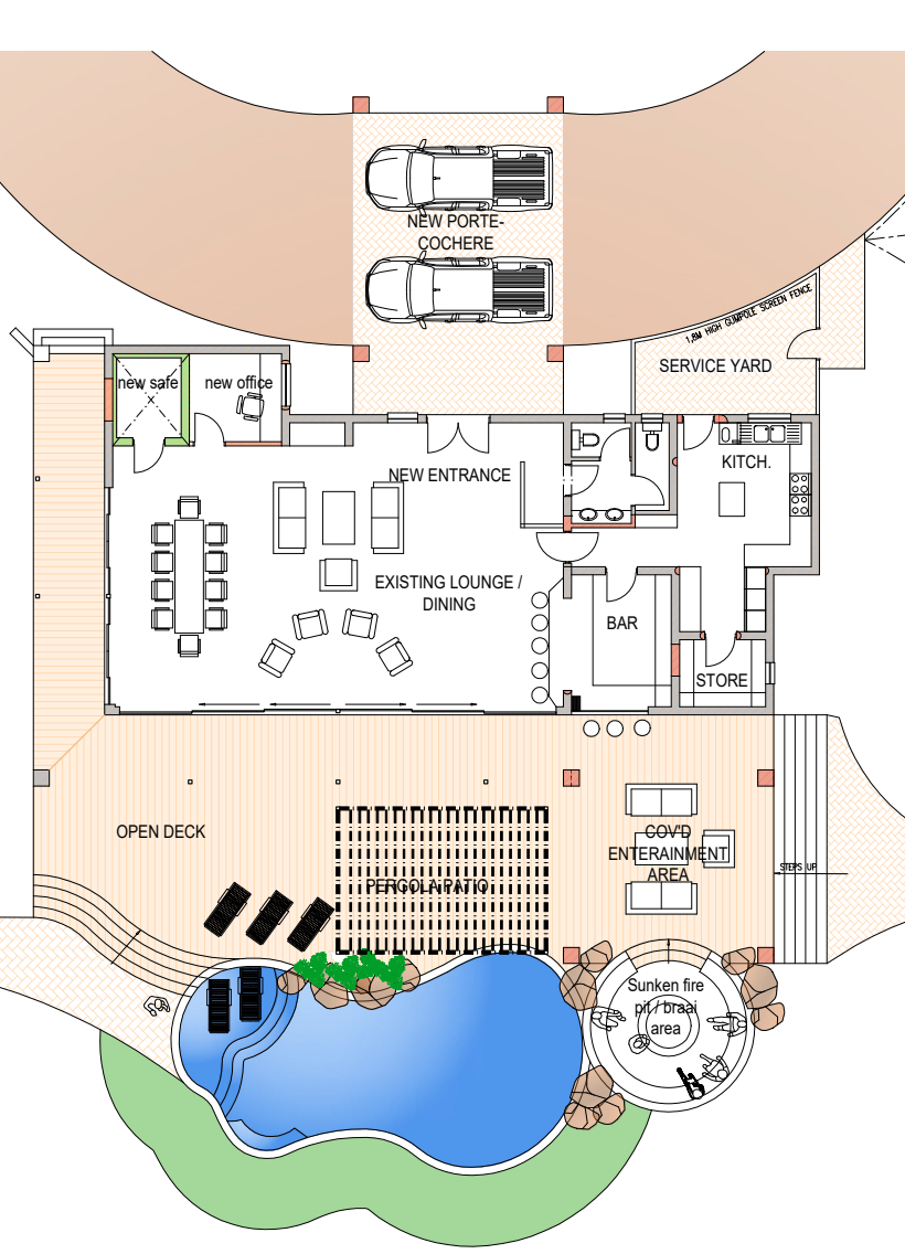 convert this floor plan into a realistic isometric 3d view of a full house show the space from an elevated angle with furniture walls and details visible modern bushveld central lodge facility use the same furniture as shows on the plan do not change the orientation of the floorplan