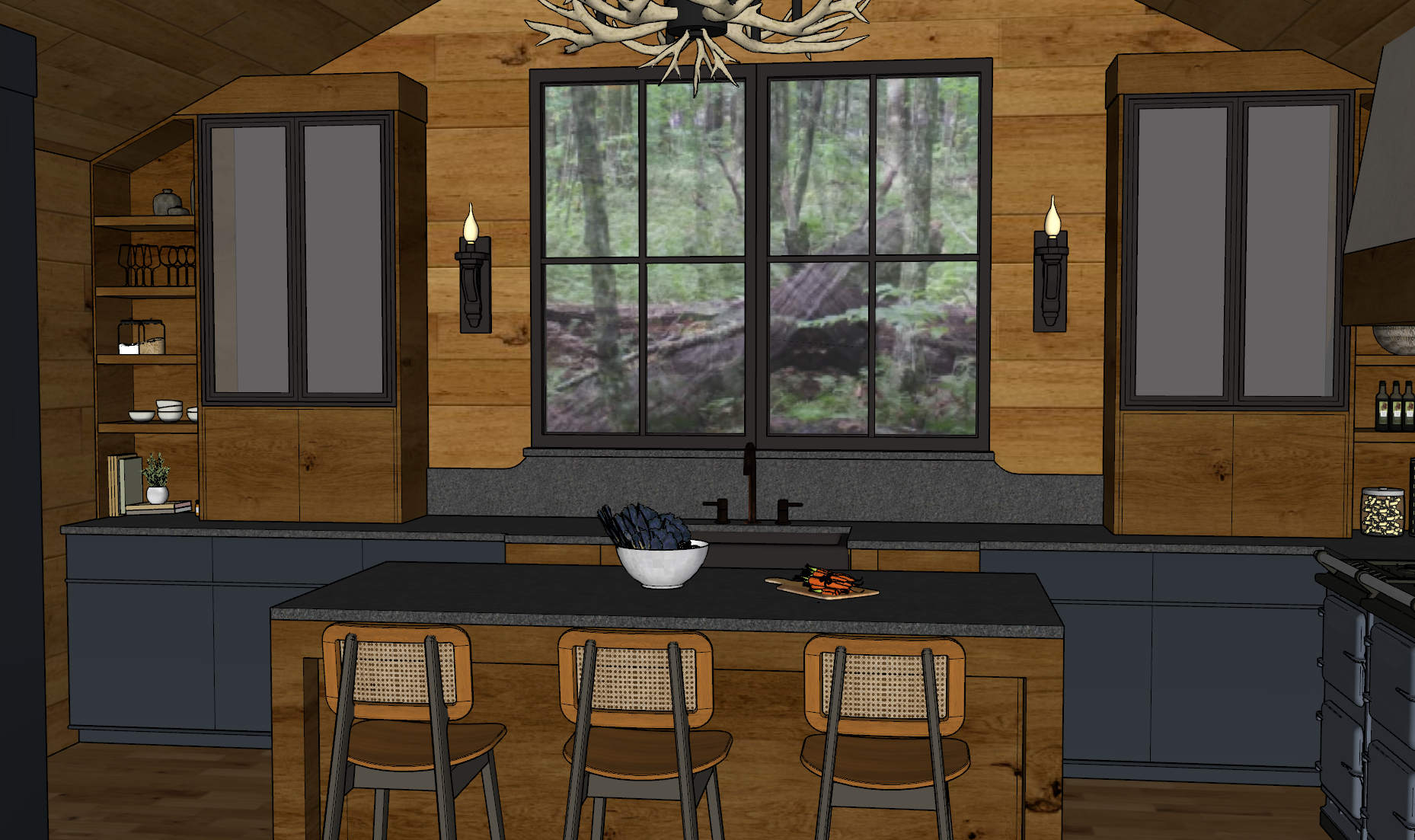classical exterior shot render a cozy rustic kitchen interior featuring warm wooden walls and ceilings in rich oak tones the cabinets are a smooth slate gray complemented by a dark granite countertop highlight the antler chandelier above the island casting a soft warm light the forest view through large windows should be lush and green creating a serene atmosphere include natural textures with wooden bar stools and soft ambient lighting from the wall sconces add subtle details like a bowl of fresh produce on the countertop and white porcelain dishes on the shelves capture the warm inviting atmosphere of a countryside retreat architecture