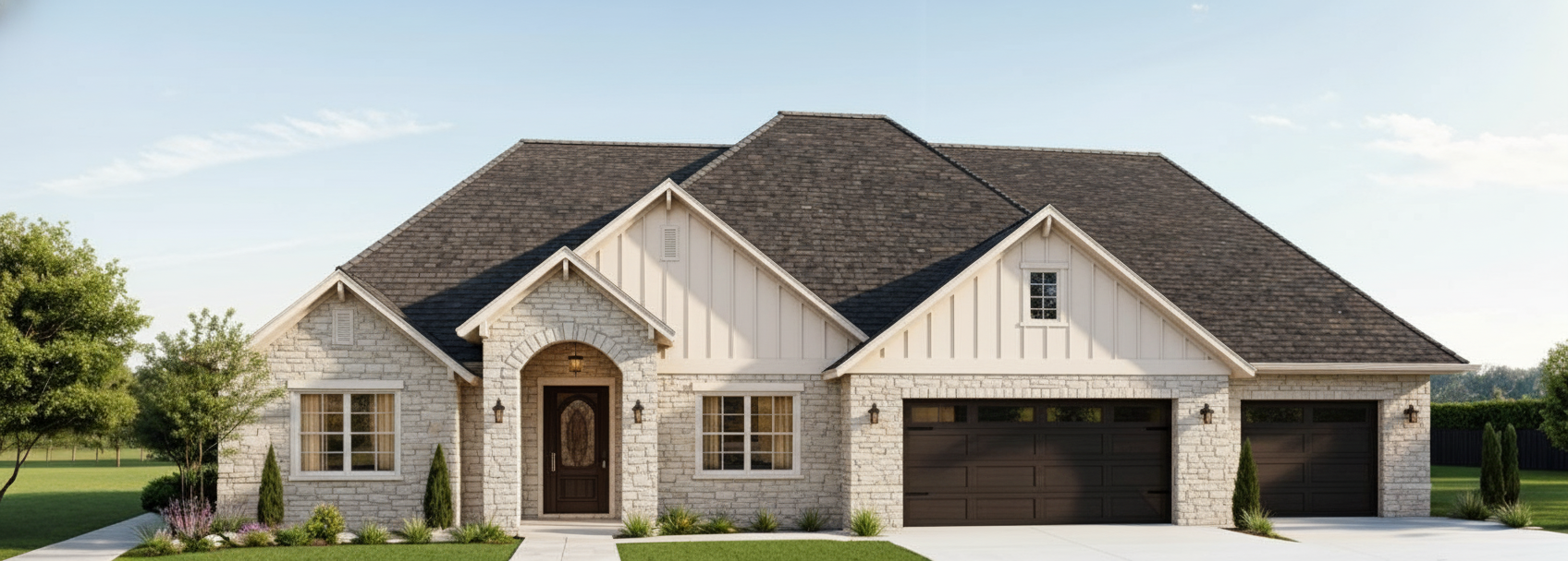 keep the rendering quality and material quality the same keep the window coloring and fascia coloring the same take out the siding above the two car garage and replace with stone extend the stone from the bottom half to go all the way up that wall take the siding to the right of the front porch and extend it all the way down no half wall materials