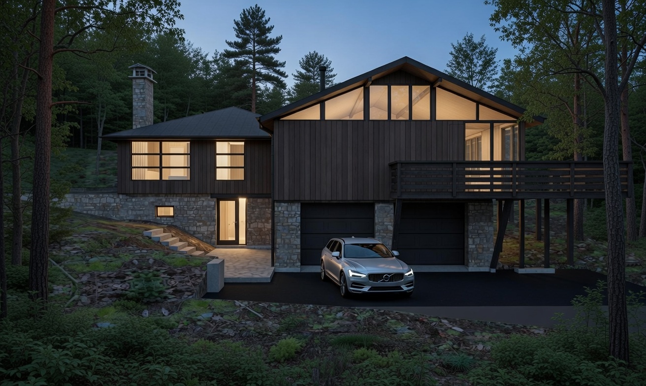 add more driveway in the foreground and more low shrubbery and groundcovers