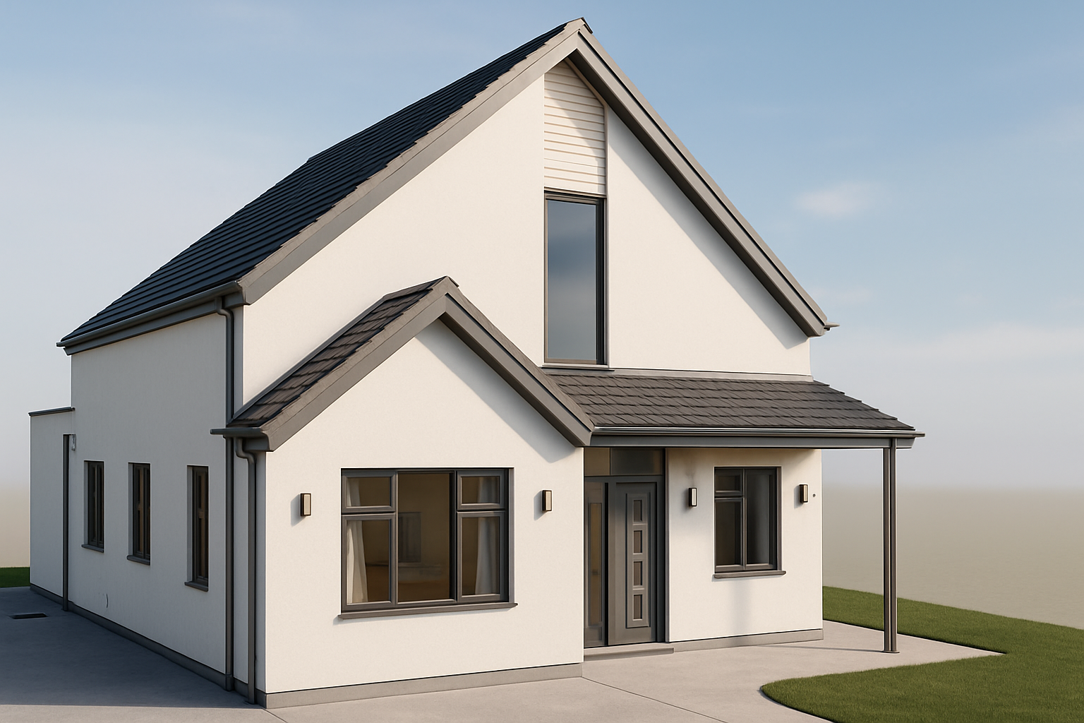 don t change the structure a large traditional modern home made from the following materials white cream dry stacked stone horizontal dull brown wood siding dull brown wood timber columns and a gray asphalt shingle roof enhance all of these materials to have better texture shadows and depth enhance the terrain in the background to be more realistic and natural adding trees rocks and dirt with better depth and realism change the landscaping around the house to feel more natural and realistic change the grass to have better texture and have more green in it change the sky to be a more clear less clouds day enhance the lighting in the environment to feel more realistic and natural being a bright sunny day