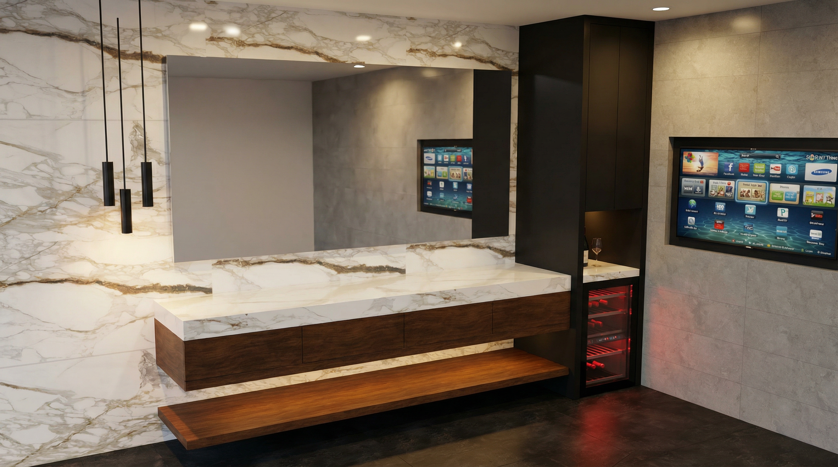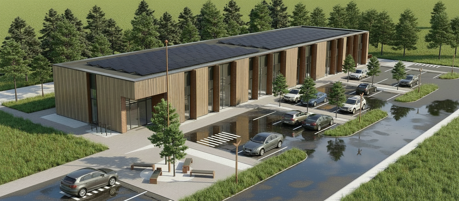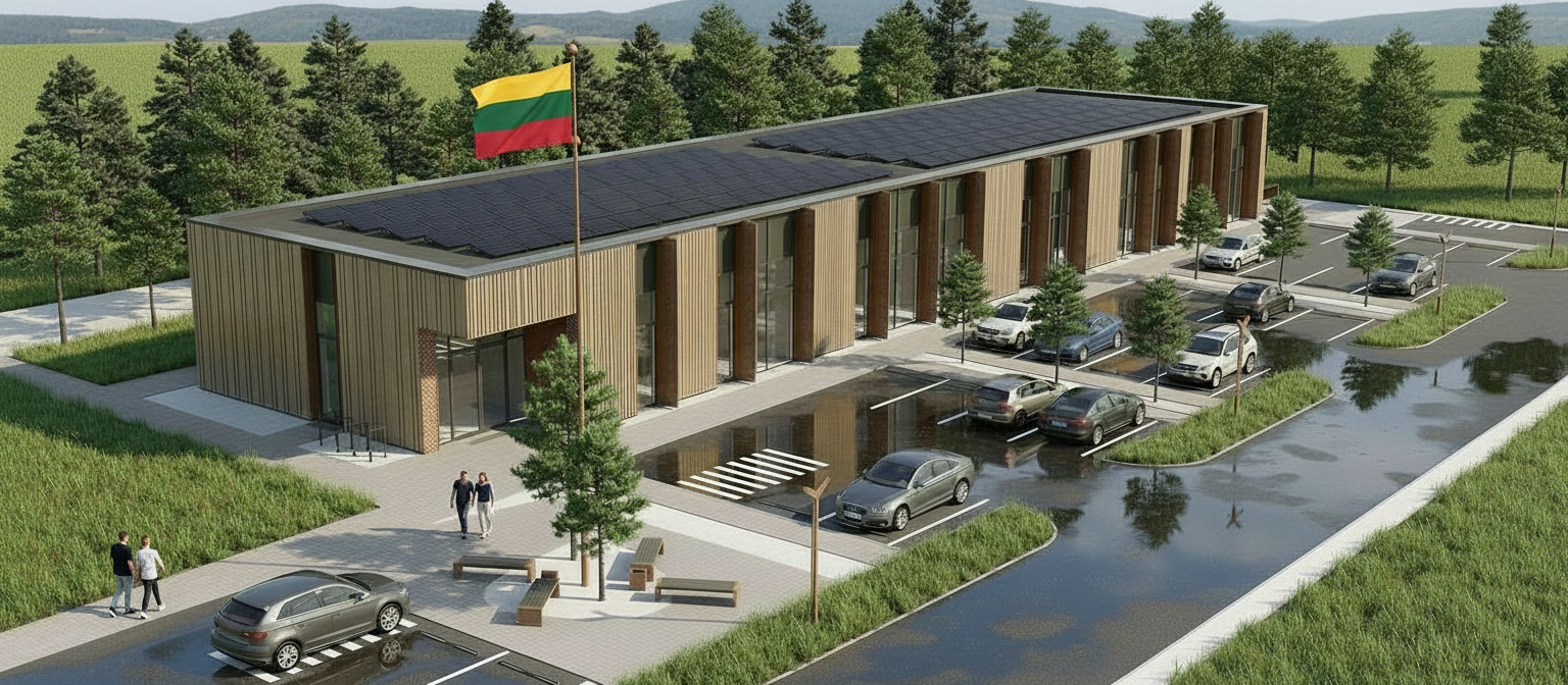 exterior shot do not change the photo and keep everything as shown only add 15 walking people on the sidewalks in the photos in the middle and on the left on the flagpole hang a non fluttering lithuanian flag architecture