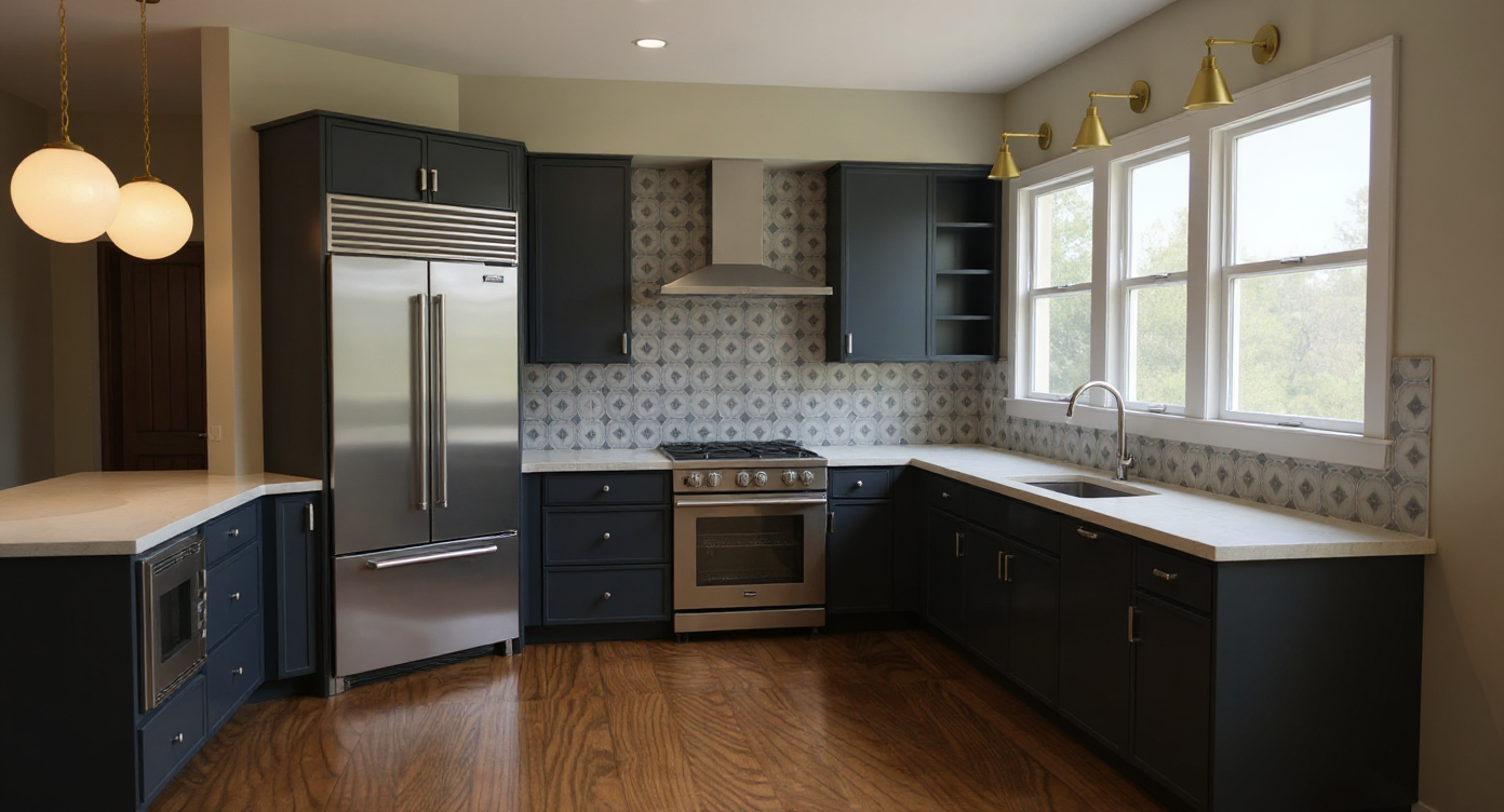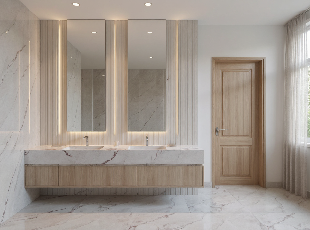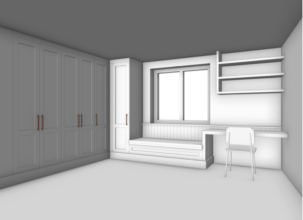 setting plaster by farbo walls and cupboard doors herringbone oak floor white ceiling rusty orange seat beneath window and curtains either side