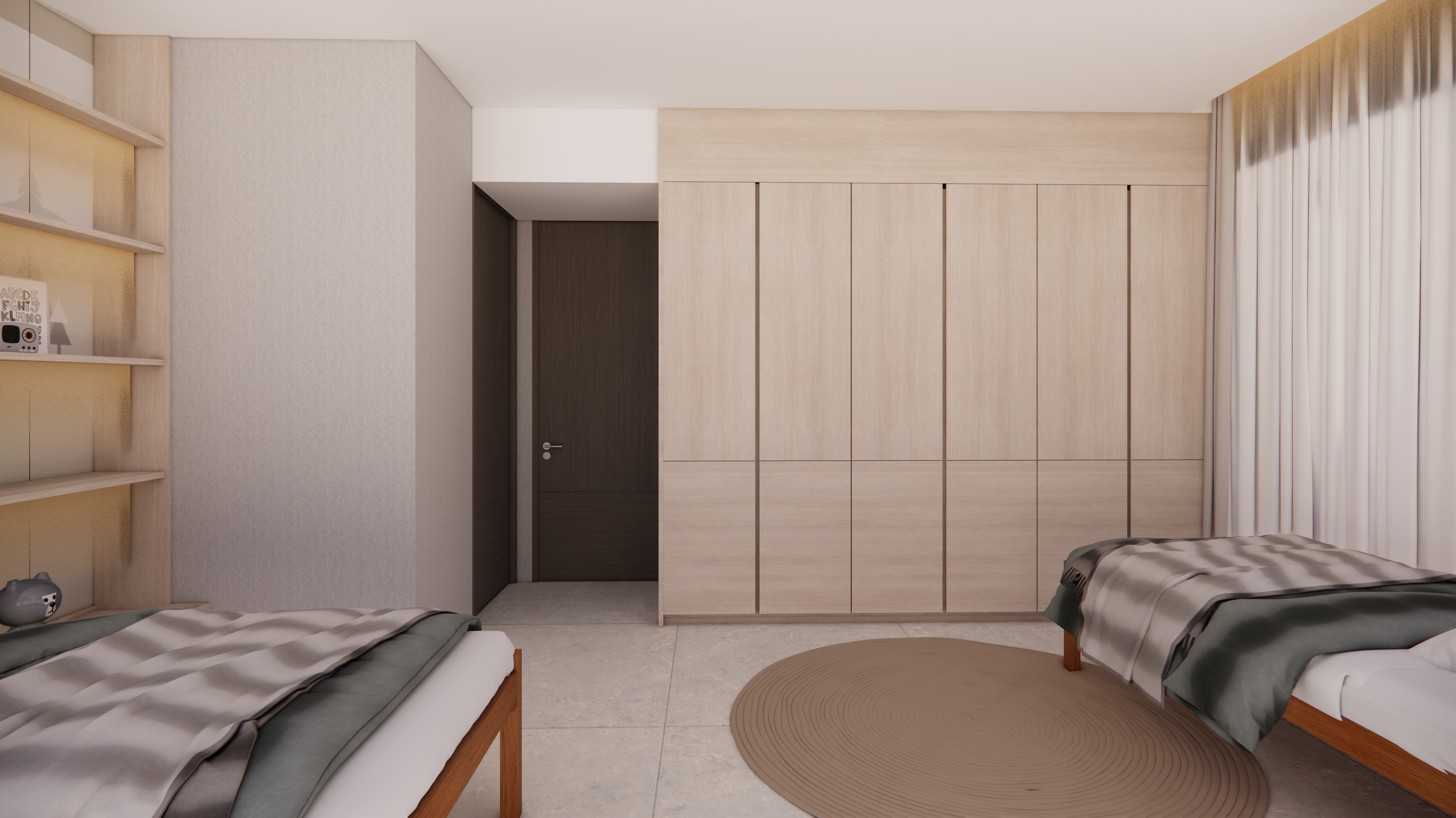 enhance the lighting quality only ensure all linear led lights and table lamps are switched on and properly illuminated add a few subtle toys placed neatly on the shelves for realism without altering the shelf design or materials improve lighting balance to achieve a warm natural and realistic atmosphere without overexposure keep the space bright clear and well lit do not change the design layout camera angle or material proposal maintain all original materials and finishes exactly as provided enhance realism through accurate lighting shadows and material rendering only produce a clean professional photorealistic architectural render