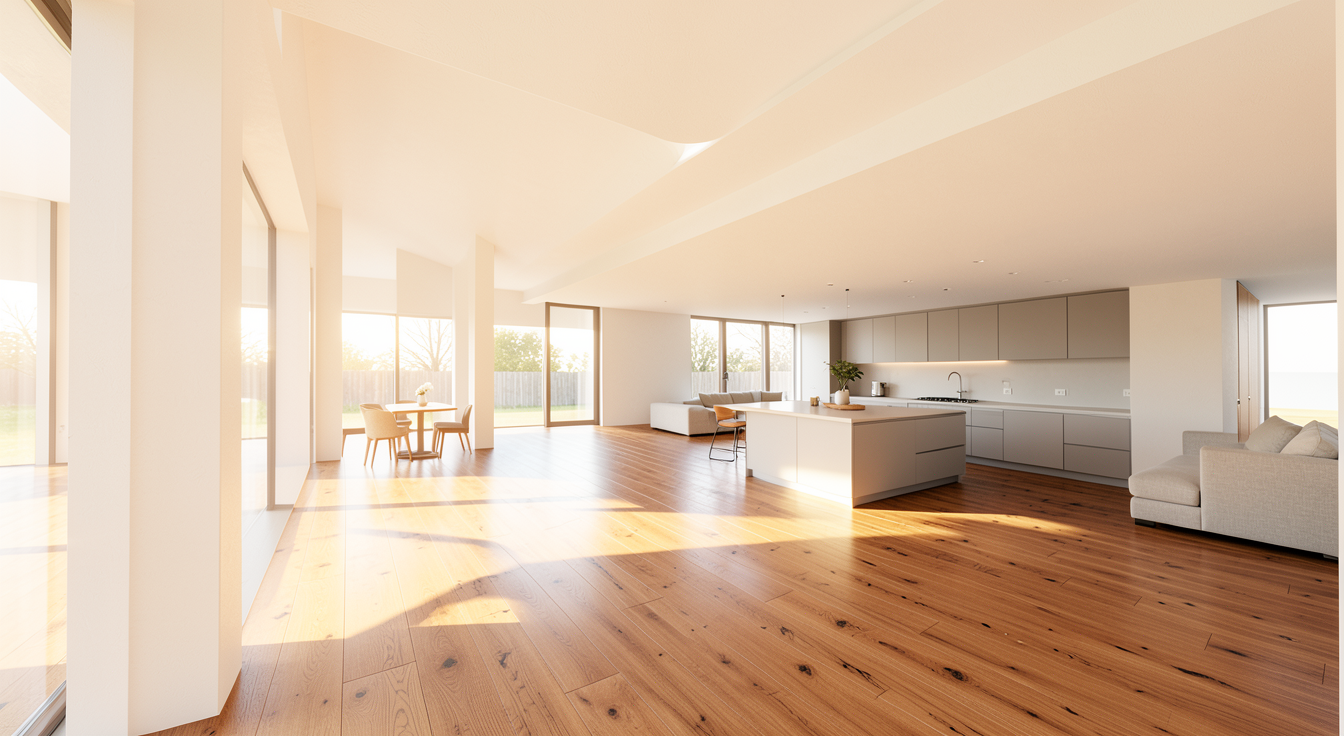monumental open plan family space with strong sunrise daylight washing the interior bright white ceiling reflecting warm golden light continuous warm oak hardwood flooring on the main level recessed kitchen area one step down minimalist island bridging the level change and functioning visually as a table height surface from the upper floor minimal cabinetry and no clutter almost empty space with only one or two understated seating elements vast negative space focus on light gradients across floor and walls wide angle 18mm architectural visualization emphasizing volume and ambient morning light