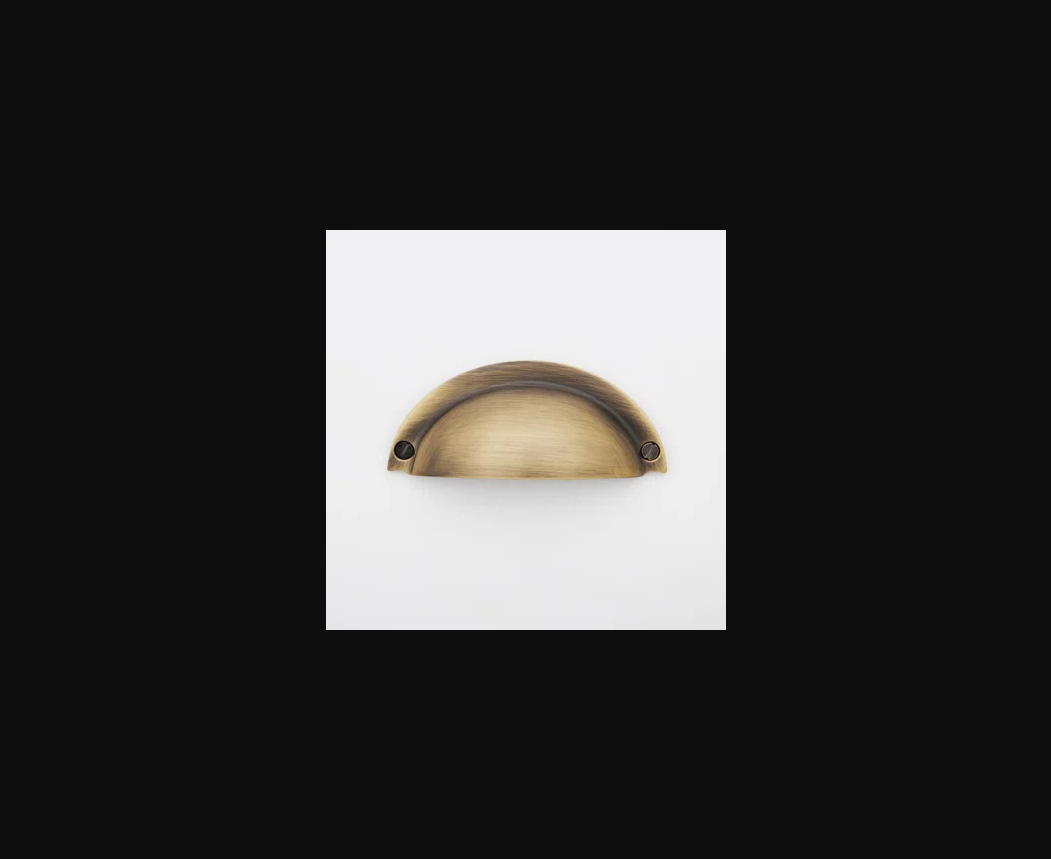 transitional kitchen with sage green cabinets and antique brass cup pull hardware this antique brass shell cup pull installed on drawer fronts cream colored upper cabinets honed marble countertops unlacquered brass fixtures white subway tile backsplash warm ambient lighting professional interior design photography