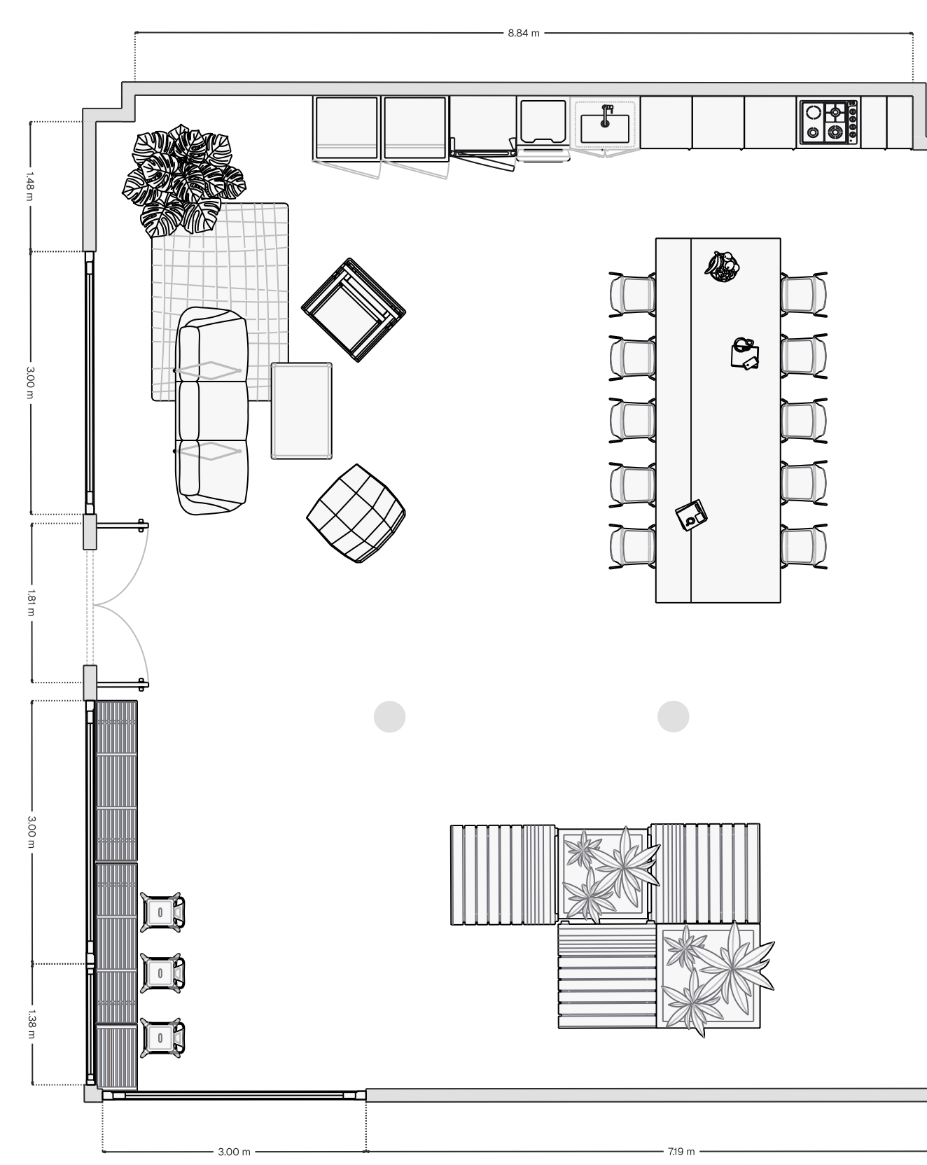 convert this floor plan into a realistic isometric 3d view of a full house show the space from an elevated angle with furniture walls and details visible warm nordic interior three design worlds combined industrial exposed concrete brushed steel dark metal arts crafts reclaimed wood linen dark cork terracotta accents mid century modern cognac leather walnut wood olive green panels aged brass details natural warm lighting with directional spotlights matte surfaces no glossy finishes neutral background light concrete floor reduced high quality atmosphere no clutter use the same furniture as shows on the plan do not change the orientation of the floorplan