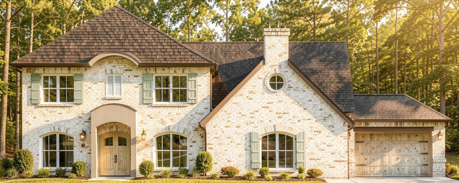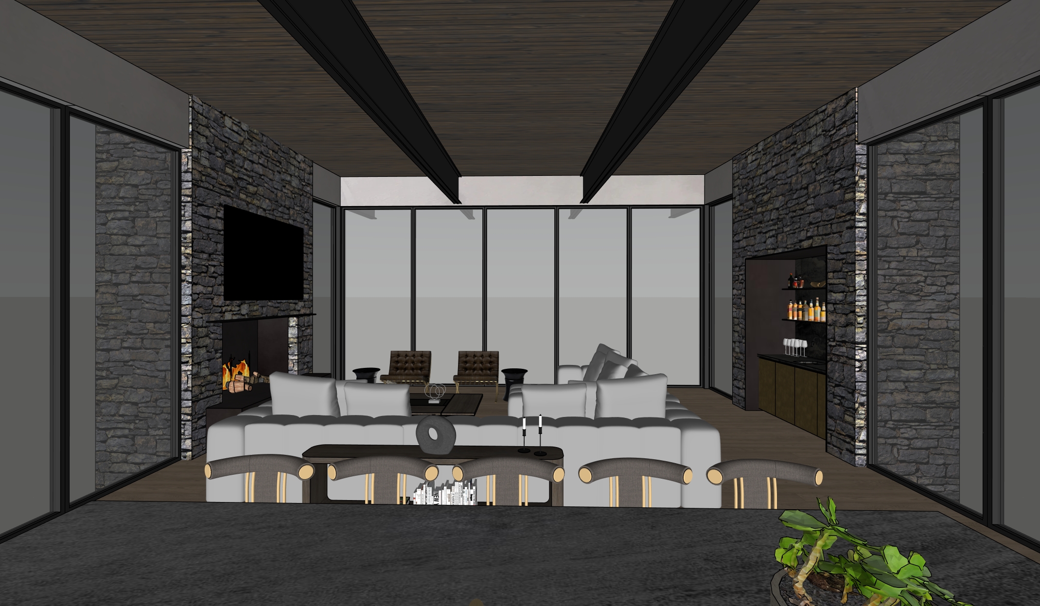 do not remove or change any geometry in image rough hewn tennessee fieldstone stained straight grain white oak tongue and groove ceiling dark metal window frames cold rolled steel beams smooth finished stucco walls brass lower cabinets and glass shelves at bar add square can lights to ceiling add integrated led lighting in bar area home located in north carolina hardwood forest with dense trees below home soft early morning light with light fog in trees behind view of blue ridge mountains in distance room is 20 above the ground so no plants or hardscape directly outside of windows
