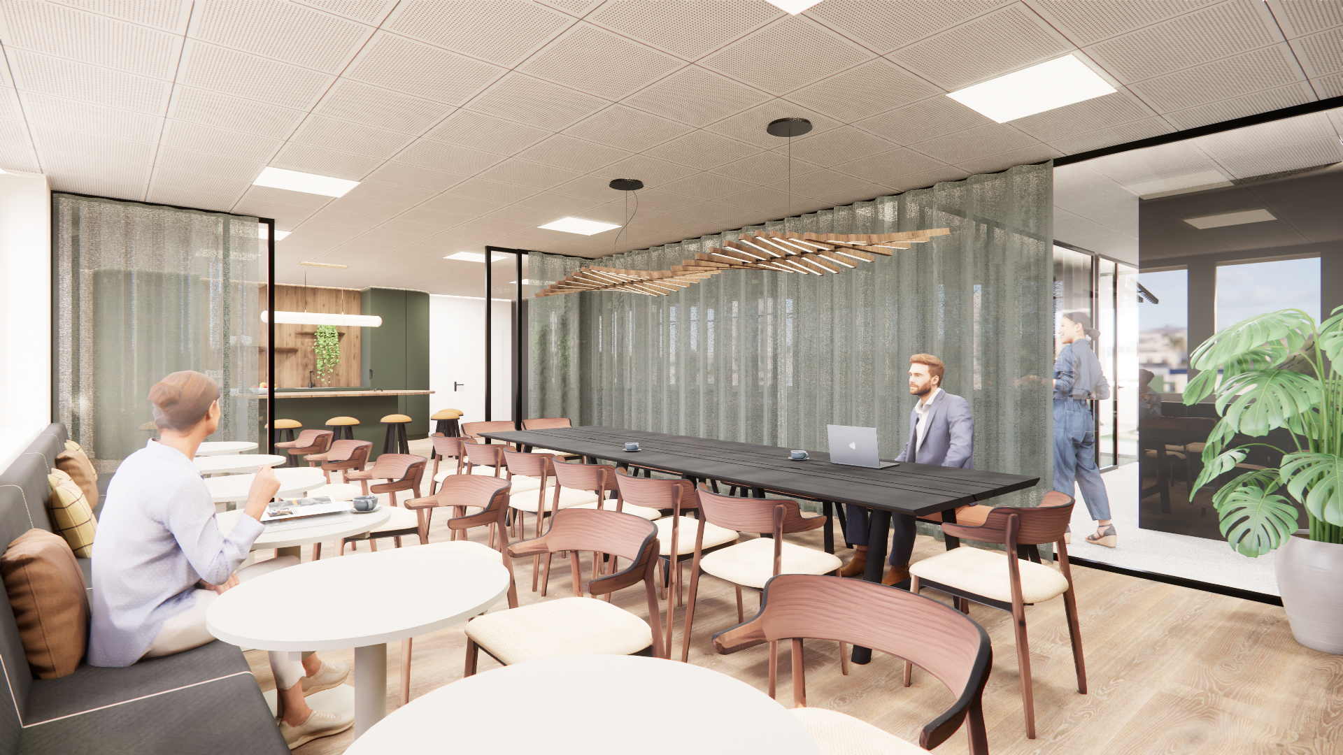 a modern coworking space with soft natural lighting the atmosphere is relaxed and professional include a large black table as the centerpiece surrounded by wooden chairs with cream cushions the floors are wood adding warmth to the room feature a plant with vibrant green leaves in a sleek pot large glass partitions create a sense of openness capture the lively interaction of people working and enjoying coffee