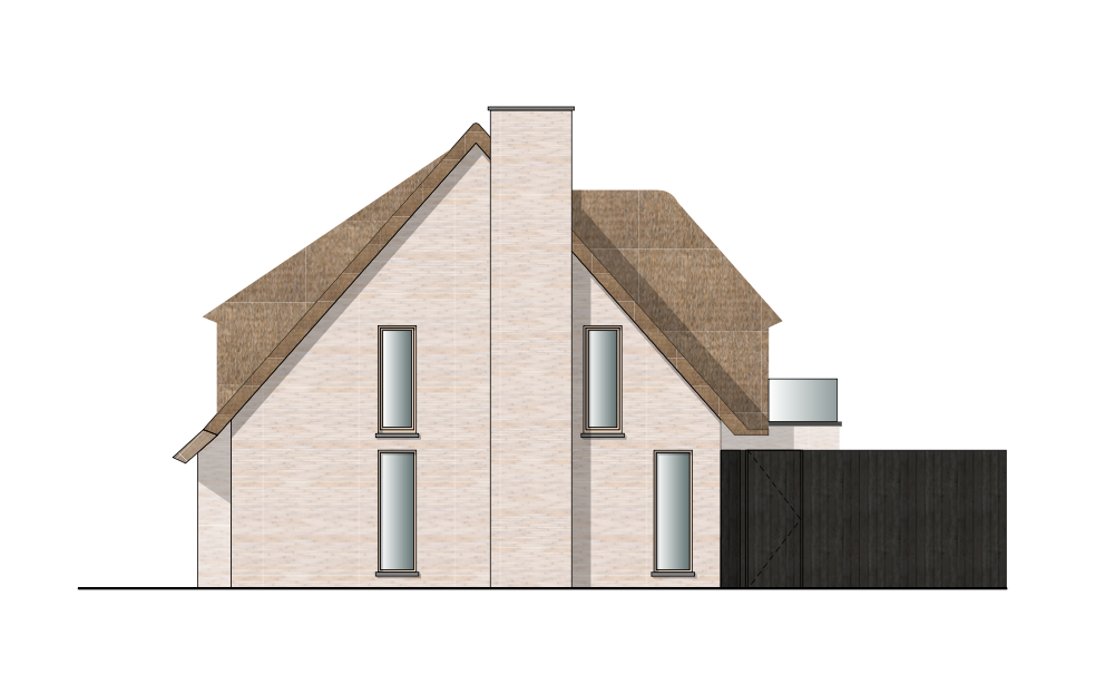 white long brick light beige windows thatched roof black wooden wall in a tree like environment