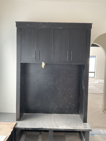 do not change the cabinets at all preserve the exact cabinet colors materials finishes door style drawer style hardware proportions reveals geometry and alignment exactly as shown do not alter the countertop flooring walls ceiling angles perspective lighting direction appliances or any architectural elements keep the camera viewpoint absolutely identical only remove clutter construction materials and unfinished areas clean the room and make it look fully finished add only minimal tasteful staging items appropriate for the space do not add any furniture or change anything about the cabinets countertop or room structure negative constraints no cabinet changes no perspective changes no angle changes no color changes no resizing no shape changes no geometry changes no filler changes no hardware changes no new cabinetry no wall changes no added shadows that distort structure clean the dust off of the cabinets stage for a mudroom bench with coats hanging and shoes in the open cubbies stage the background on the right as a living room
