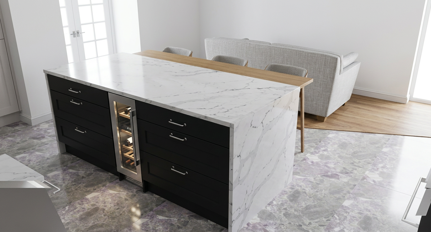 turn 3d into realistic render turn the lights on above the table and led strips in the cupboard there is natural light coming from the left through large windows you can t see there is no led strip on the ceiling nor around the door