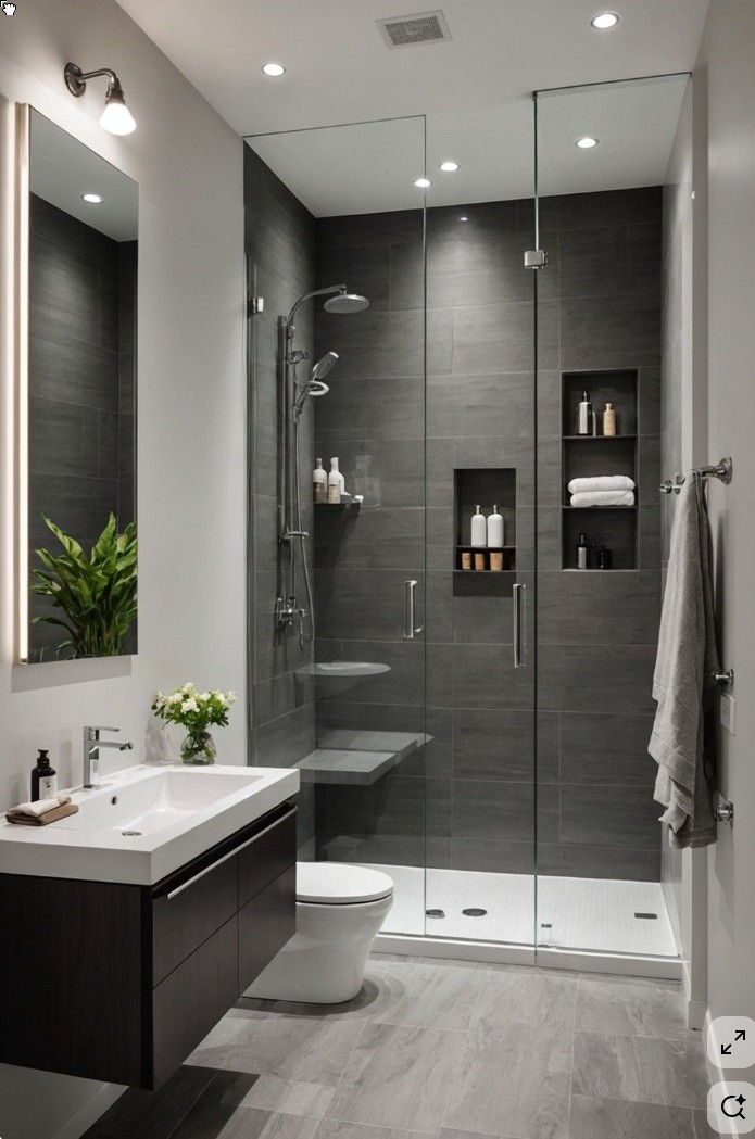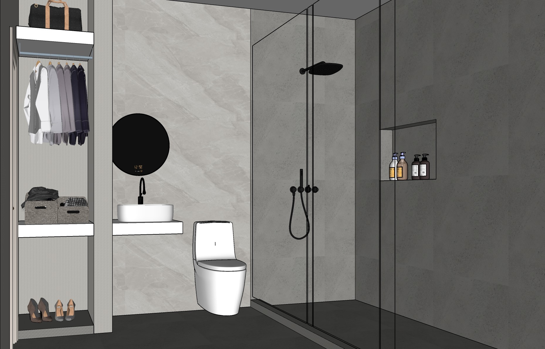 exterior shot create a beautifully modern bathroom scene with a minimalist design the walls should be textured in light grey marble the floor and ceiling in a darker shade of grey for contrast include a sleek black showerhead and fixtures adding a touch of elegance incorporate white elements for the toilet and sink enhancing the cleanliness and simplicity the open shelving should be white holding folded grey towels neatly hanging clothes in shades of white and dark grey and a stylish black bag add a black round mirror above the sink the atmosphere should be serene contemporary and sophisticated emphasizing a balance of cool tones and modern design elements