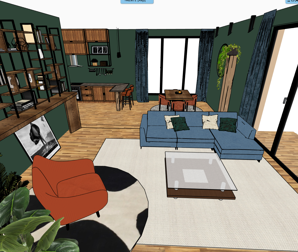create a soft loft atmosphere the wall is dark green ral6005 the parquet is oak colored striped the sofa is blue in front of it is a thin beige structured carpet the armchair dining chair and bar stools are also terracotta colored under the armchair is a black and white circular rug the shelves are walnut colored with books vases and small statues on the shelves the curtains are dark blue with a slight pattern we can see the city through the windows the kitchen is also darker brown wood with a grayish brown marble countertop the black tube spot lights beautifully shine on the wall