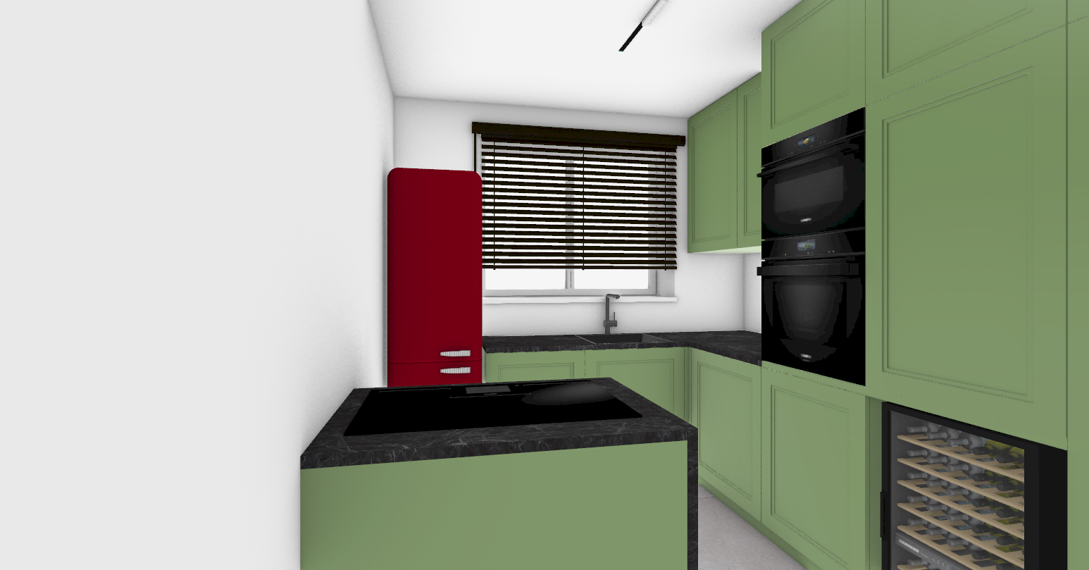 make it a photo realistic interior render don t add any lighting fixtures add led light inside the wine fridge that is located on the right side of the image make the background and natural light like the evening