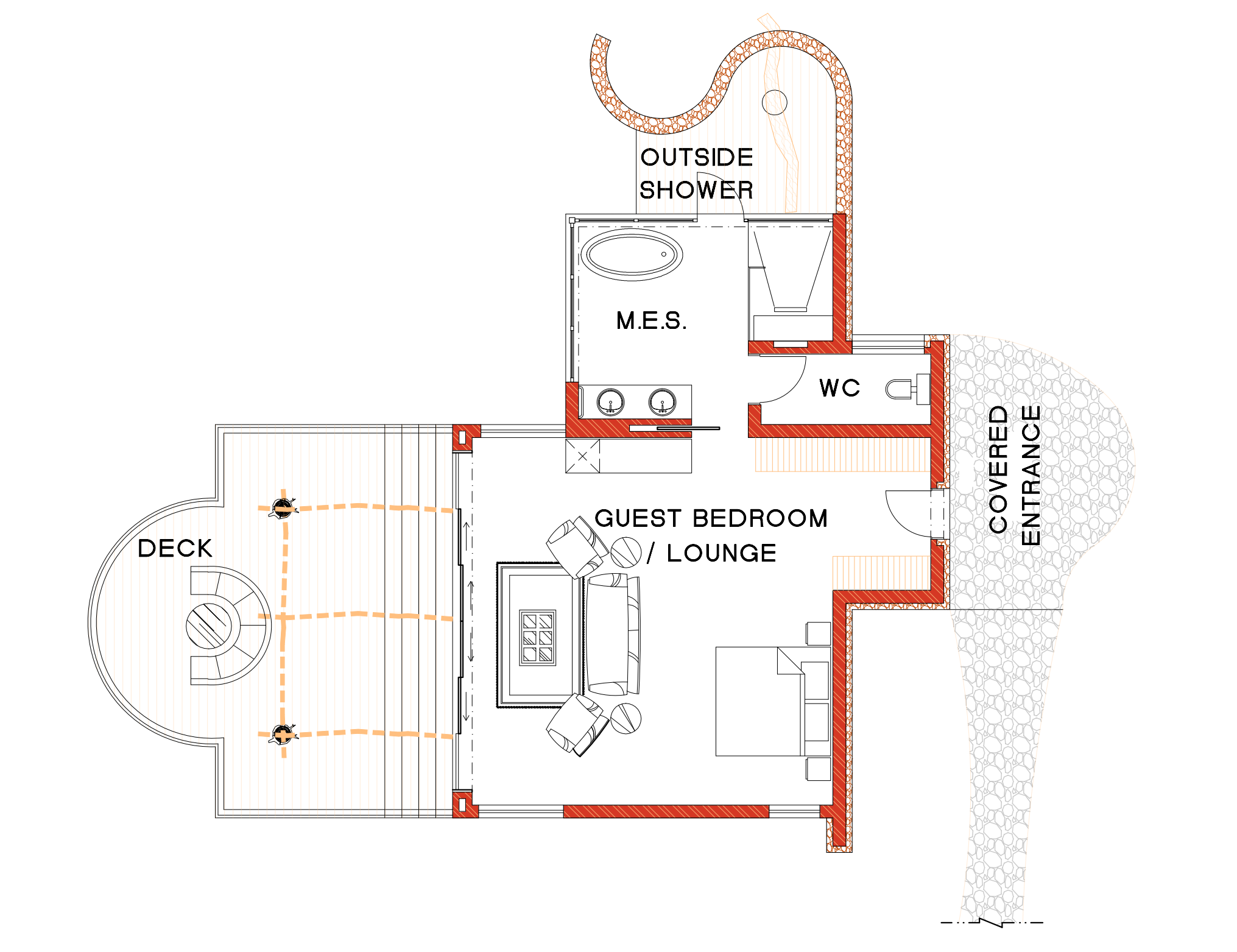 convert this floor plan into a realistic isometric 3d view of a full house show the space from an elevated angle with furniture walls and details visible modern luxury game lodge dont show any roofs use the same furniture as shows on the plan do not change the orientation of the floorplan