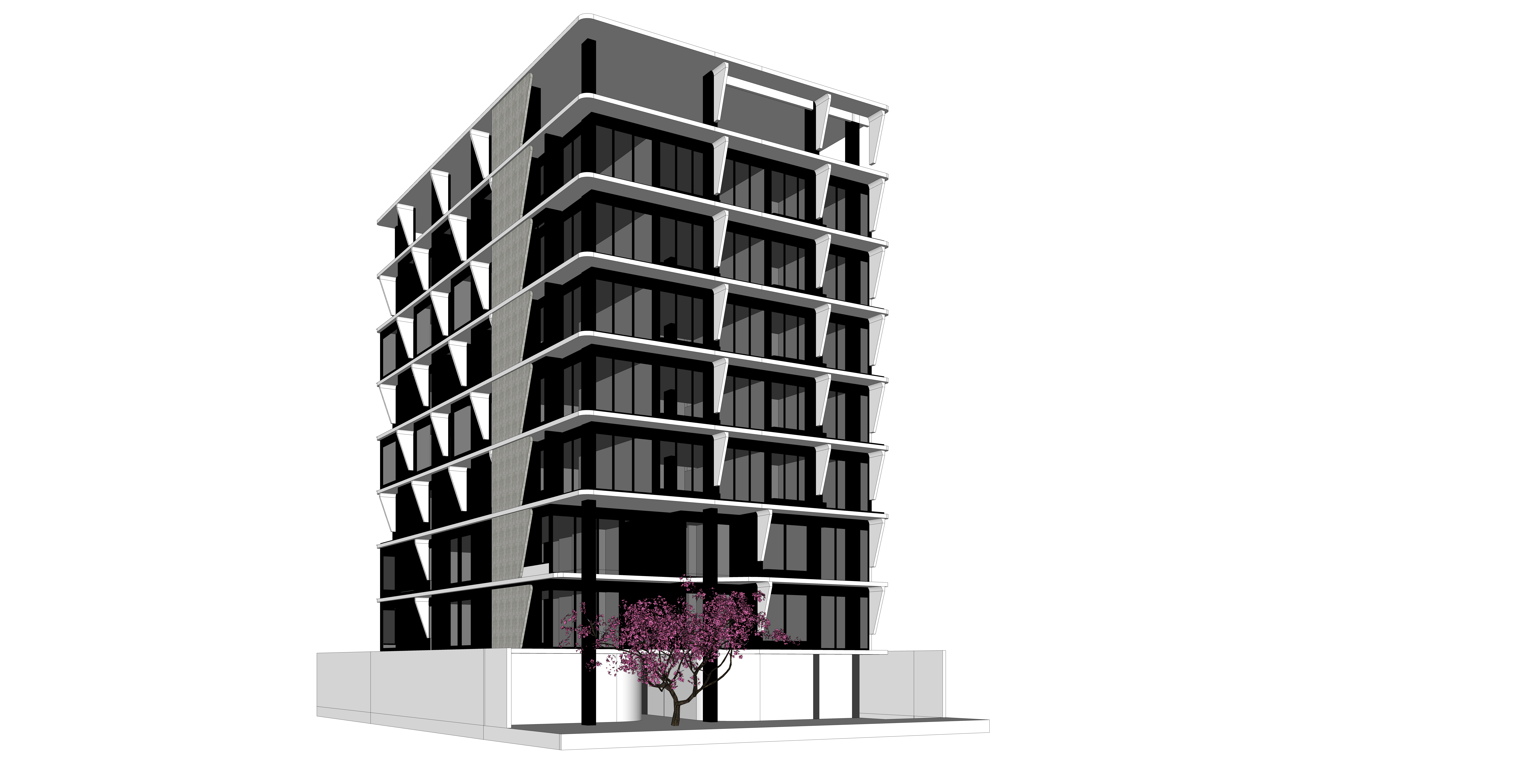 render a modernist architectural building with sleek angular lines use a palette of light gray for the concrete deep charcoal for the window frames and reflective glass the building should stand in an urban landscape with a clear blue sky and warm sunlight to create a bright and inviting atmosphere add subtle shadows for depth and dimension highlighting the building s geometric design