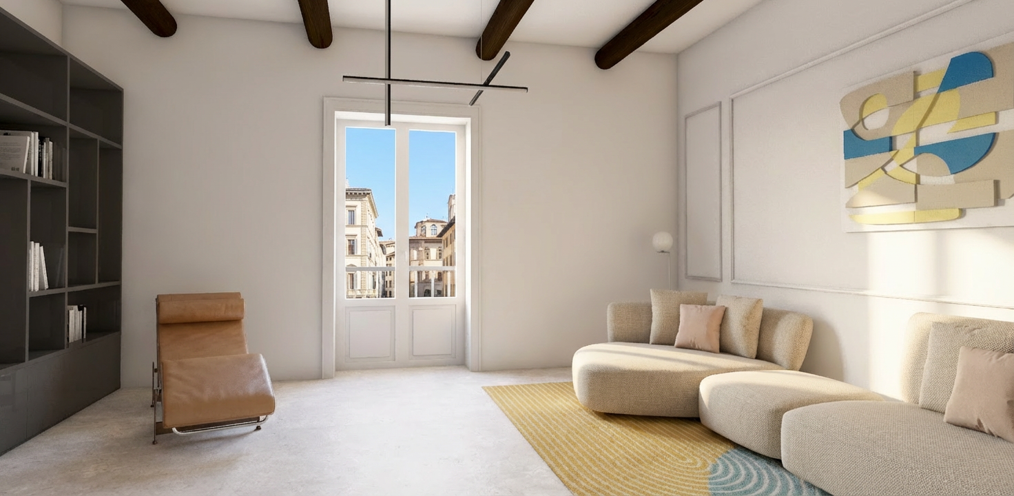 mantieni colori e texture divano in tessuto a trama colore beige chiaro con cuscini piccoli colore senape pareti bianche balcone colore bianco con vetro trasparente esterno cielo celeste e contesto con edifici d epoca bassi chaise longue con struttura in metallo e rivestimento pelle marrone medio parete attrezzata grigio scuro laccato travi in legno scuro