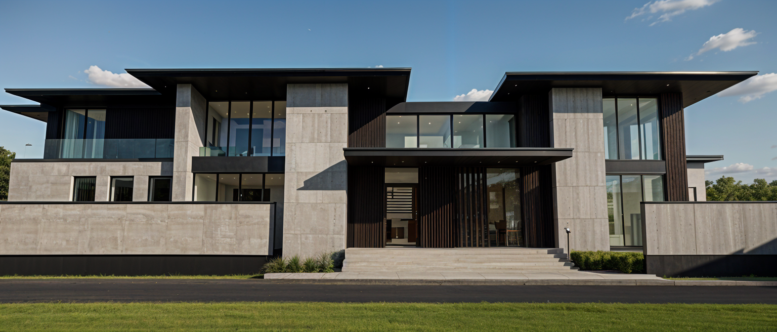 exterior walls is a combination of white limestone and dark gray fluted panels dark gray aluminum cladding ceiling panels